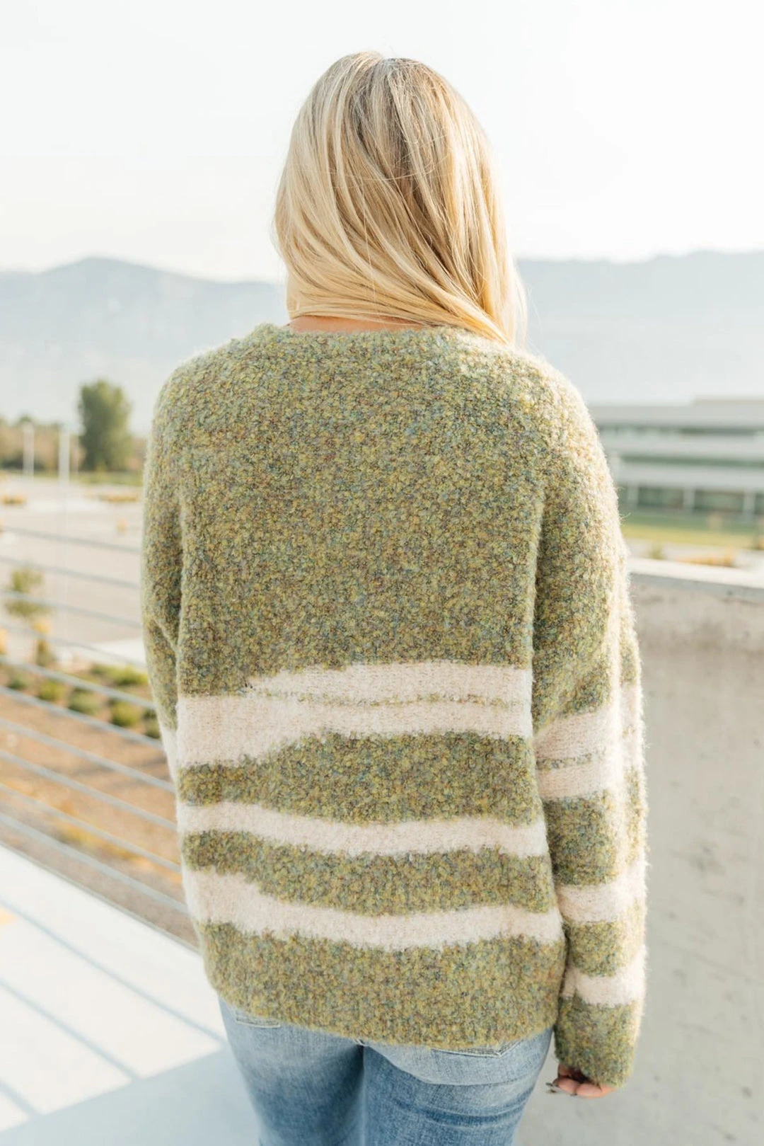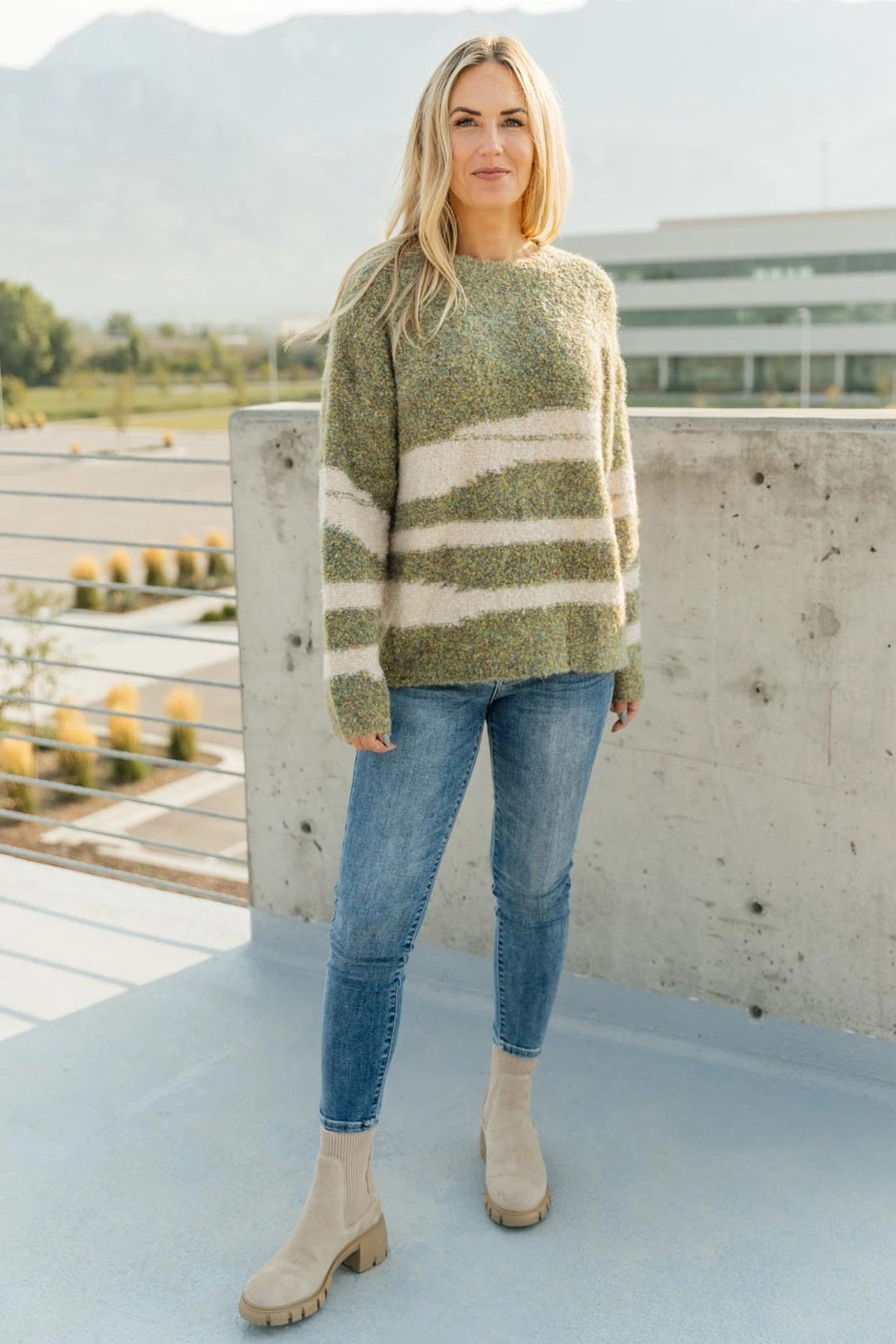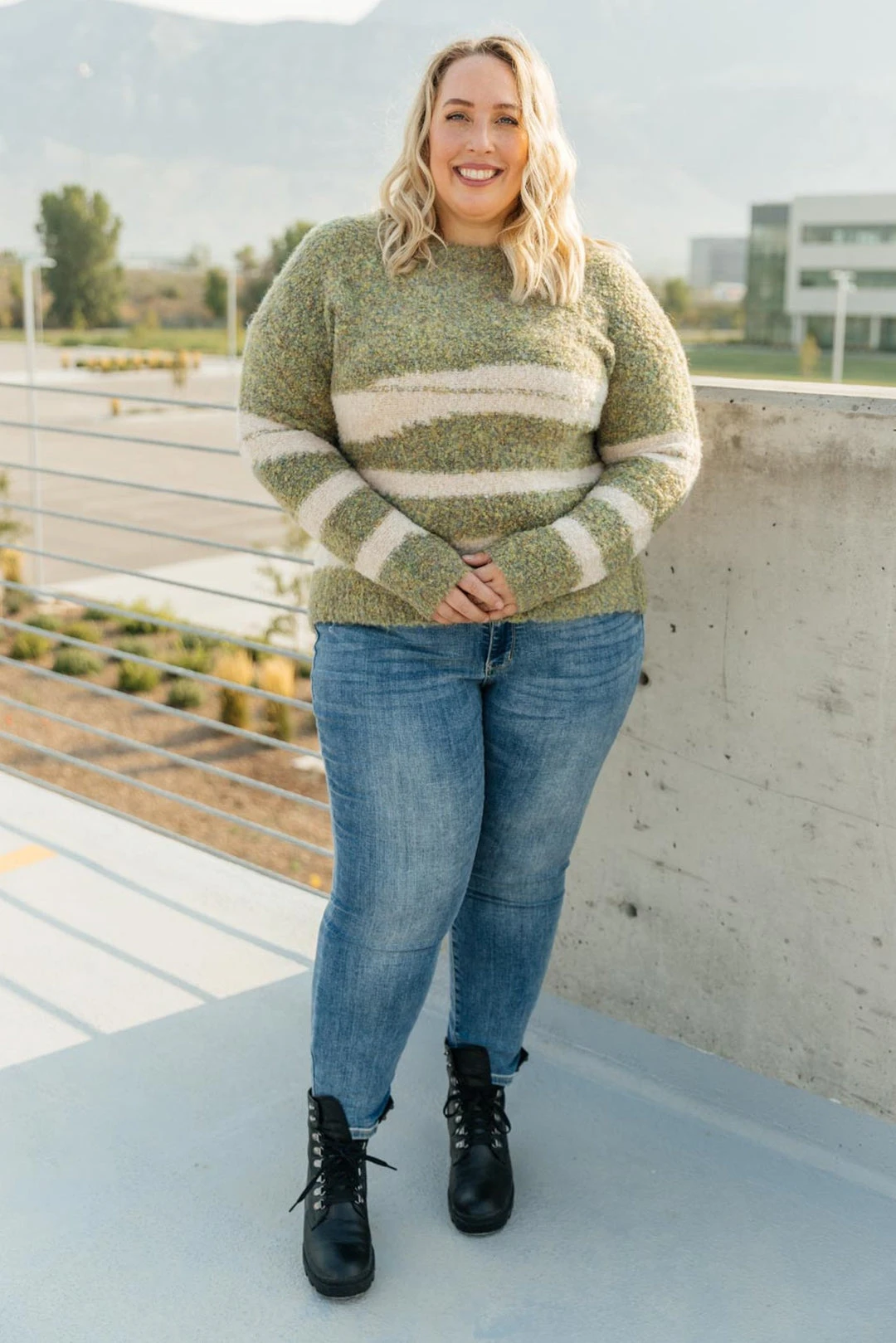 The Seeing Green Sweater is a beautiful green and white striped sweater that you’ll never want to take off! This super soft sweater has a round neckline and is made of soft stretchy material. Pair this sweater with jeans and your favorite fall boots.
