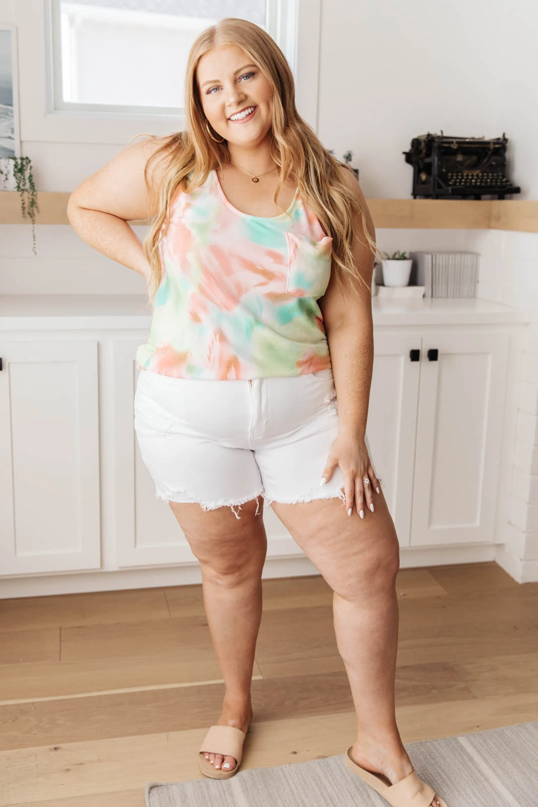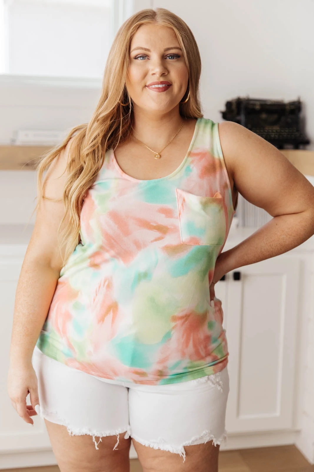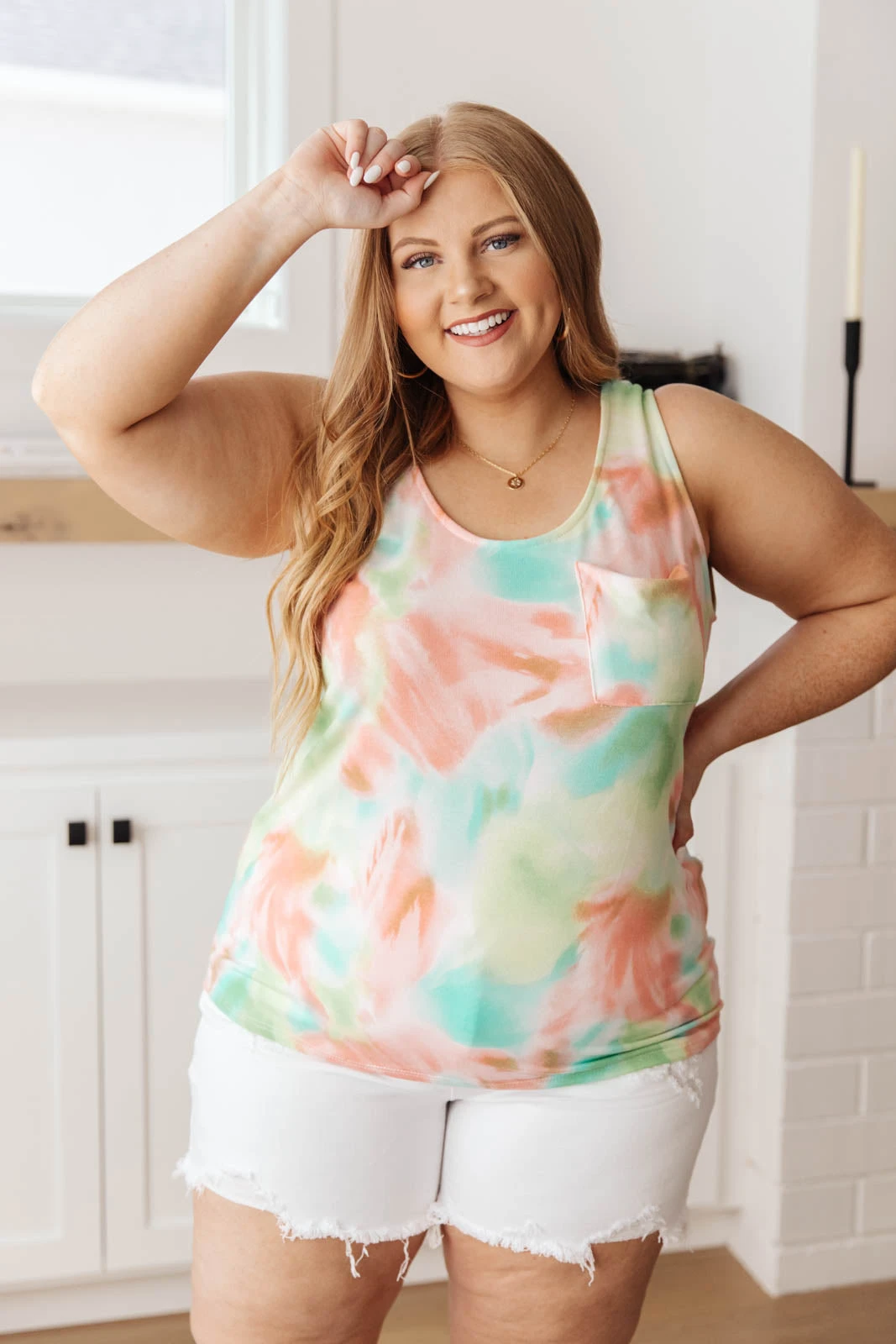 The Sherbet Splotches Tank is a trendy and fun item to add to your Summer wardrobe! The lightweight and super soft material makes it the perfect comfy tee, and the pocket adds a cute extra detail. Pair it with the matching Sherbet Splotches Shorts or your favorite pair of denim for the perfect casual outfit.