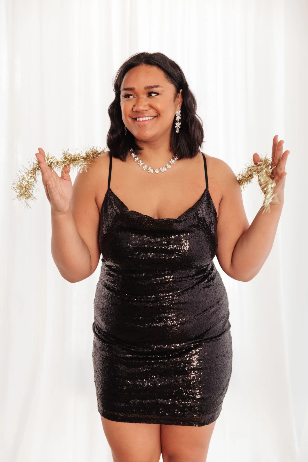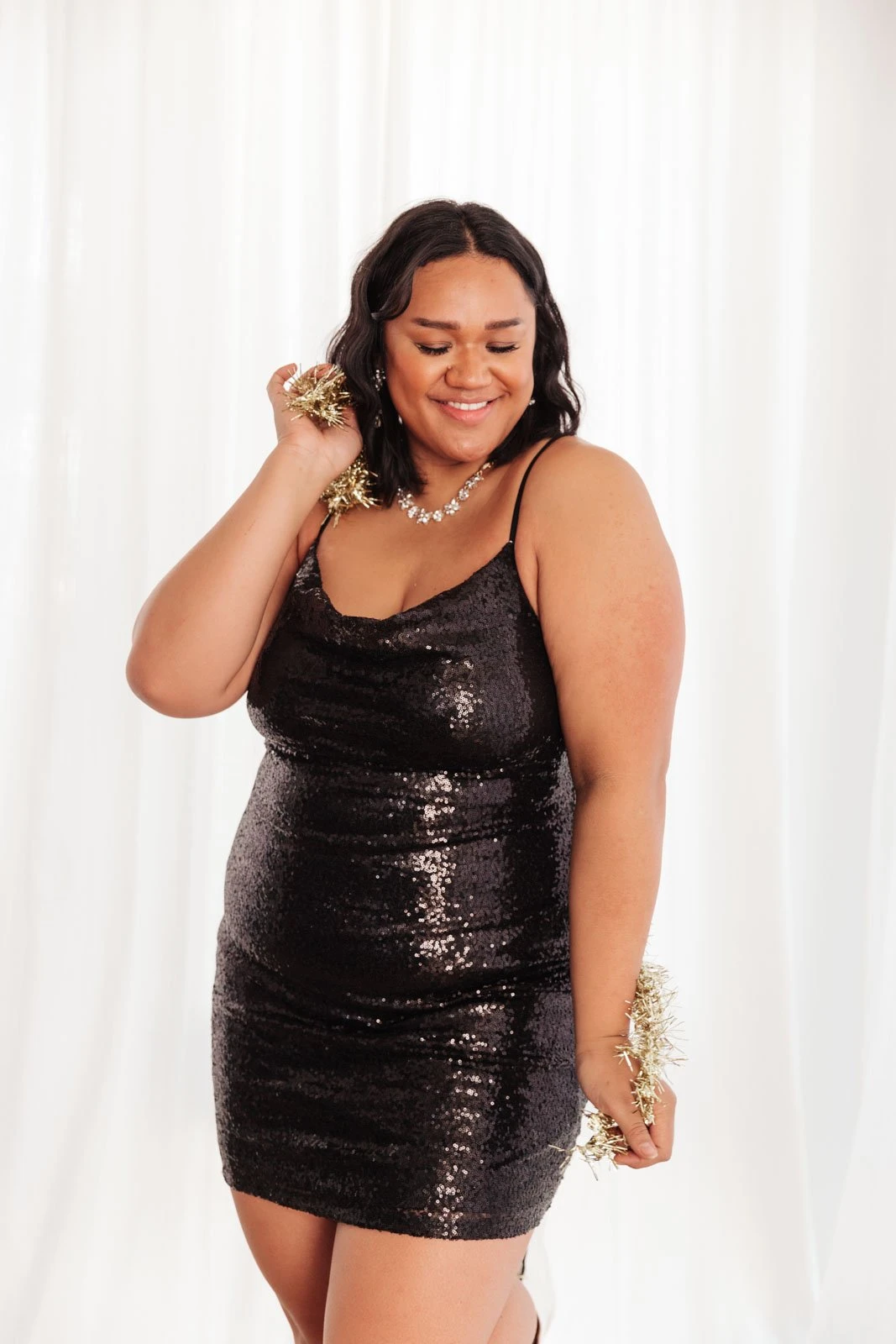 The clock strikes twelve and what will you be wearing? The Shining in Sequins Dress of course! Shine your way through the night in this gorgeous sequined piece featuring criss-cross adjustable spaghetti straps, fully lined body and a cowl neckline. Perfect for holiday parties and layered under a faux fur coat!