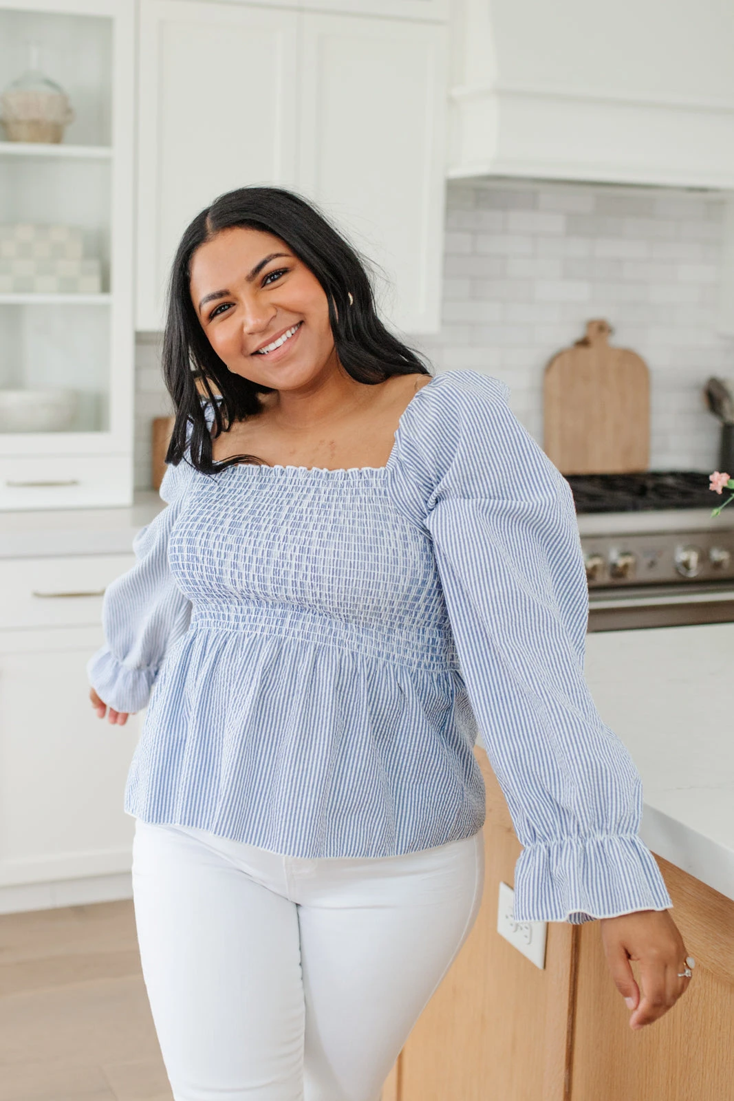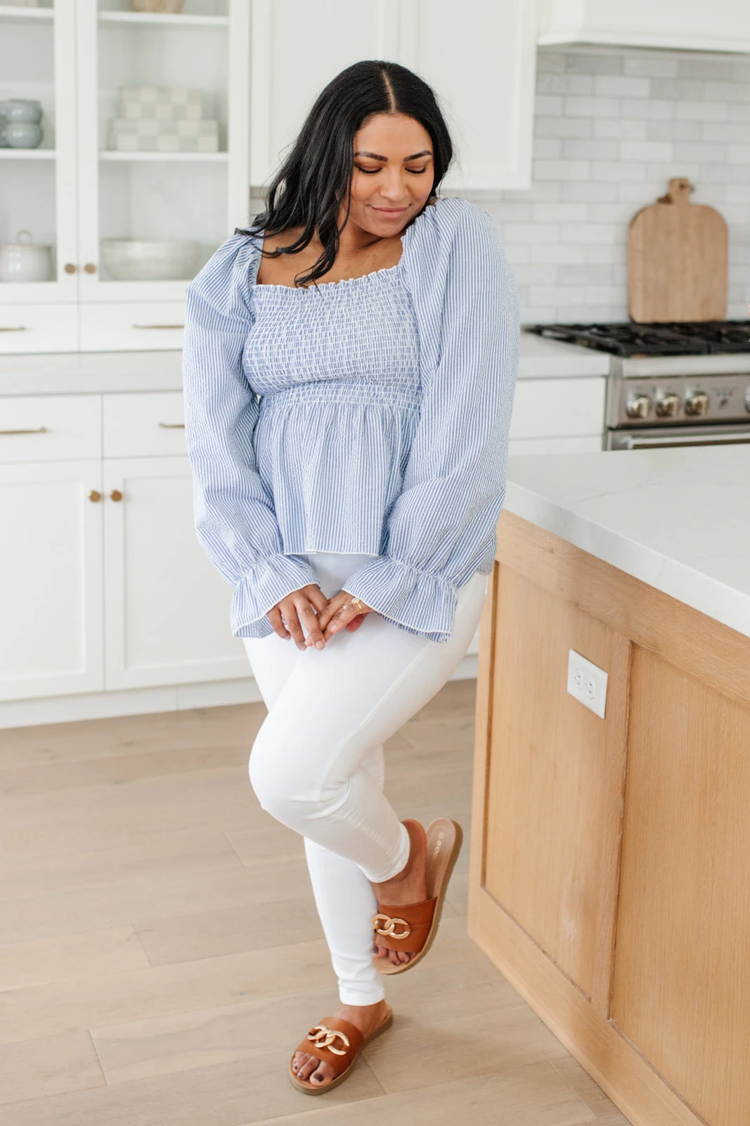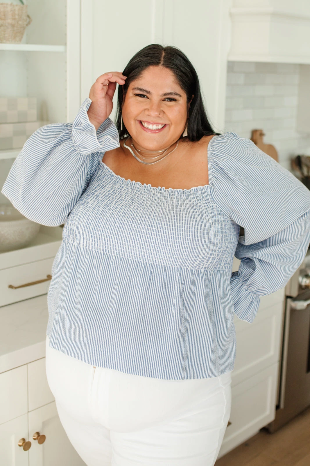 Whether you’re sailing the waves or combing the beach, the Skyscraper Top is the perfect must-have! A lightweight fabric decorated in a blue and white pin striped pattern, shapes a square neckline, shirred bodice that flows into a peplum hem, and balloon sleeves with ruffle cuffs. This adorable top pairs perfectly with white jeans, tan sandals, and a matching bag!