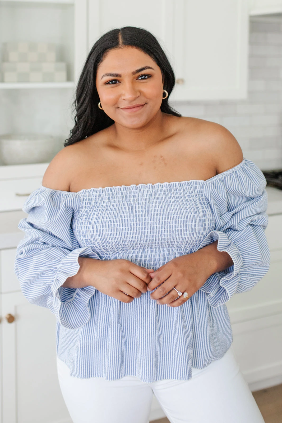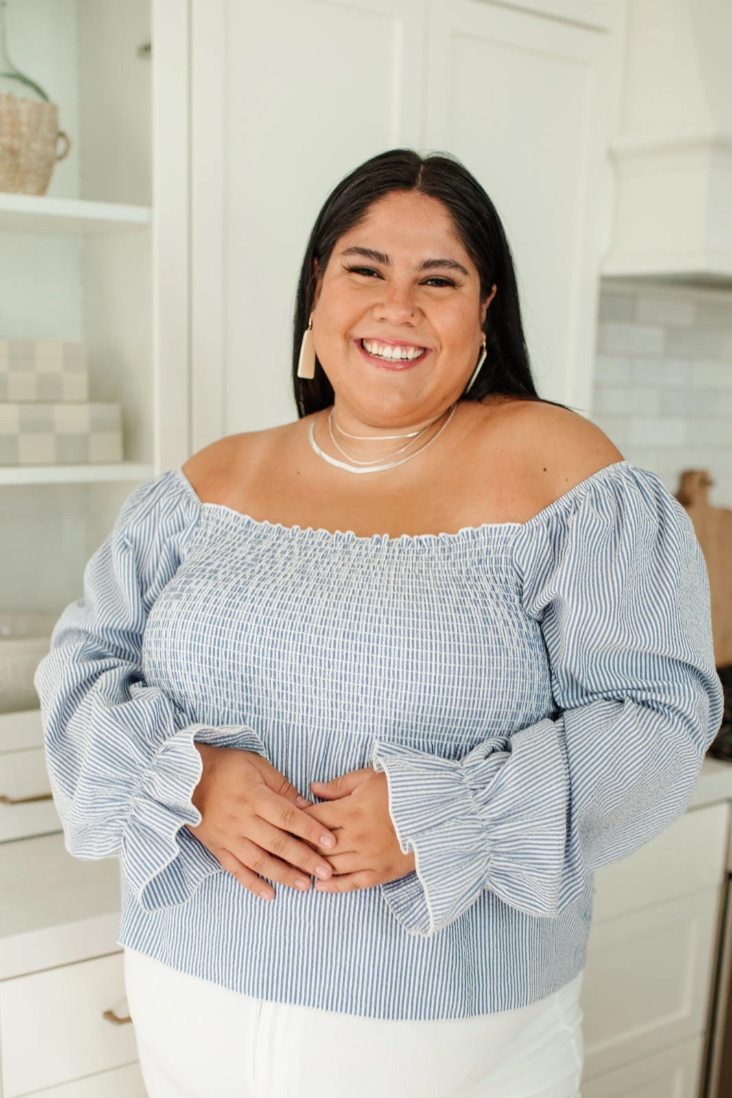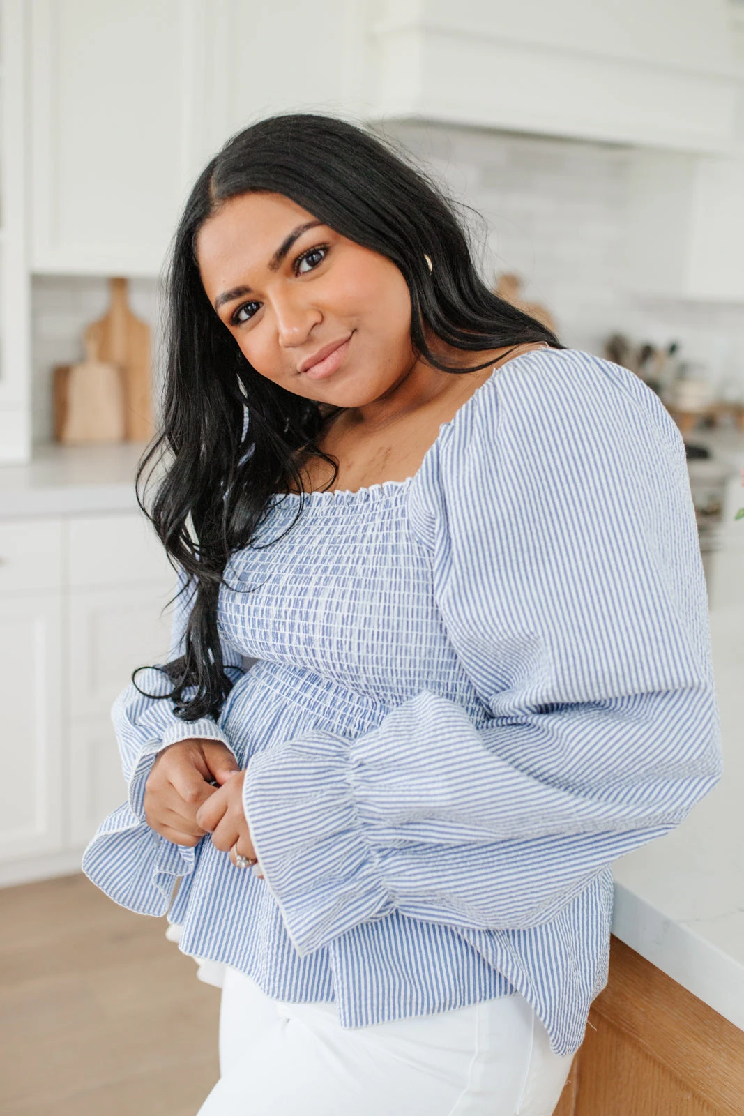 Whether you’re sailing the waves or combing the beach, the Skyscraper Top is the perfect must-have! A lightweight fabric decorated in a blue and white pin striped pattern, shapes a square neckline, shirred bodice that flows into a peplum hem, and balloon sleeves with ruffle cuffs. This adorable top pairs perfectly with white jeans, tan sandals, and a matching bag!
