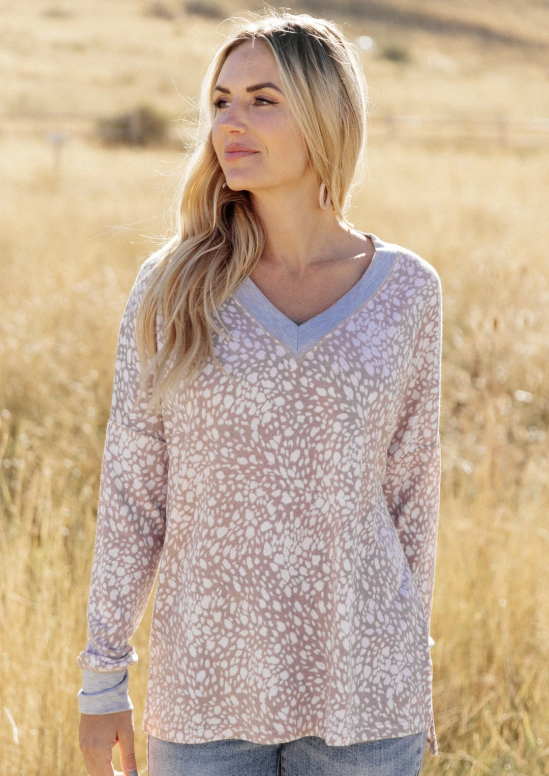 Keywords: Gray Top, Animal Print, Long Sleeve Top, V Neck
