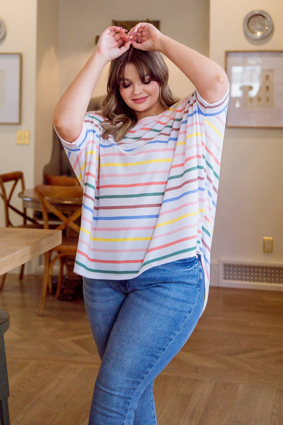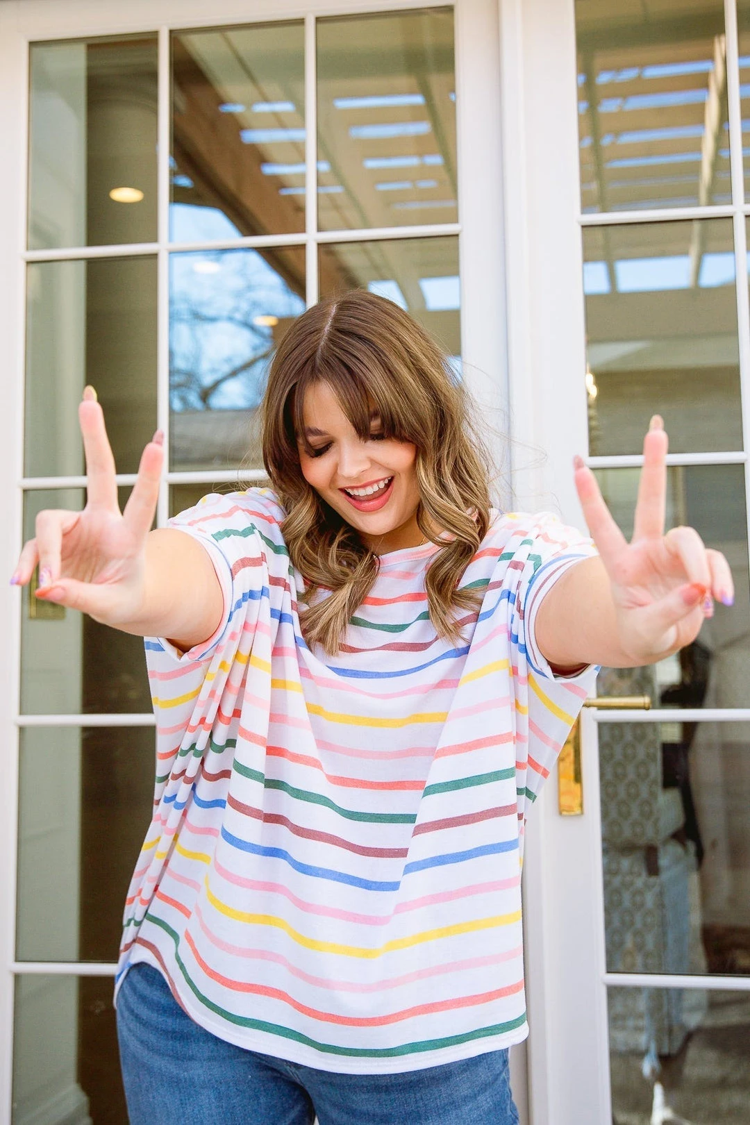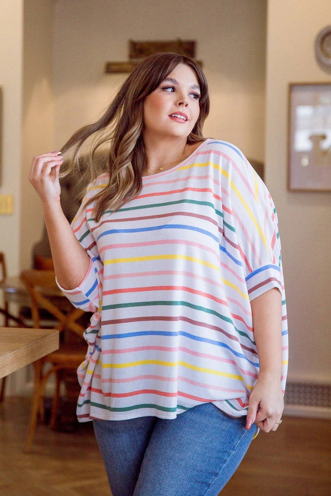 Lets talk about the Spring Talk Top! A dolman sleeve, flowy bodice, and colorful striped pattern, shape this perfect spring top! Pair with denim shorts and sandals, or white jeans for a fun and playful look!