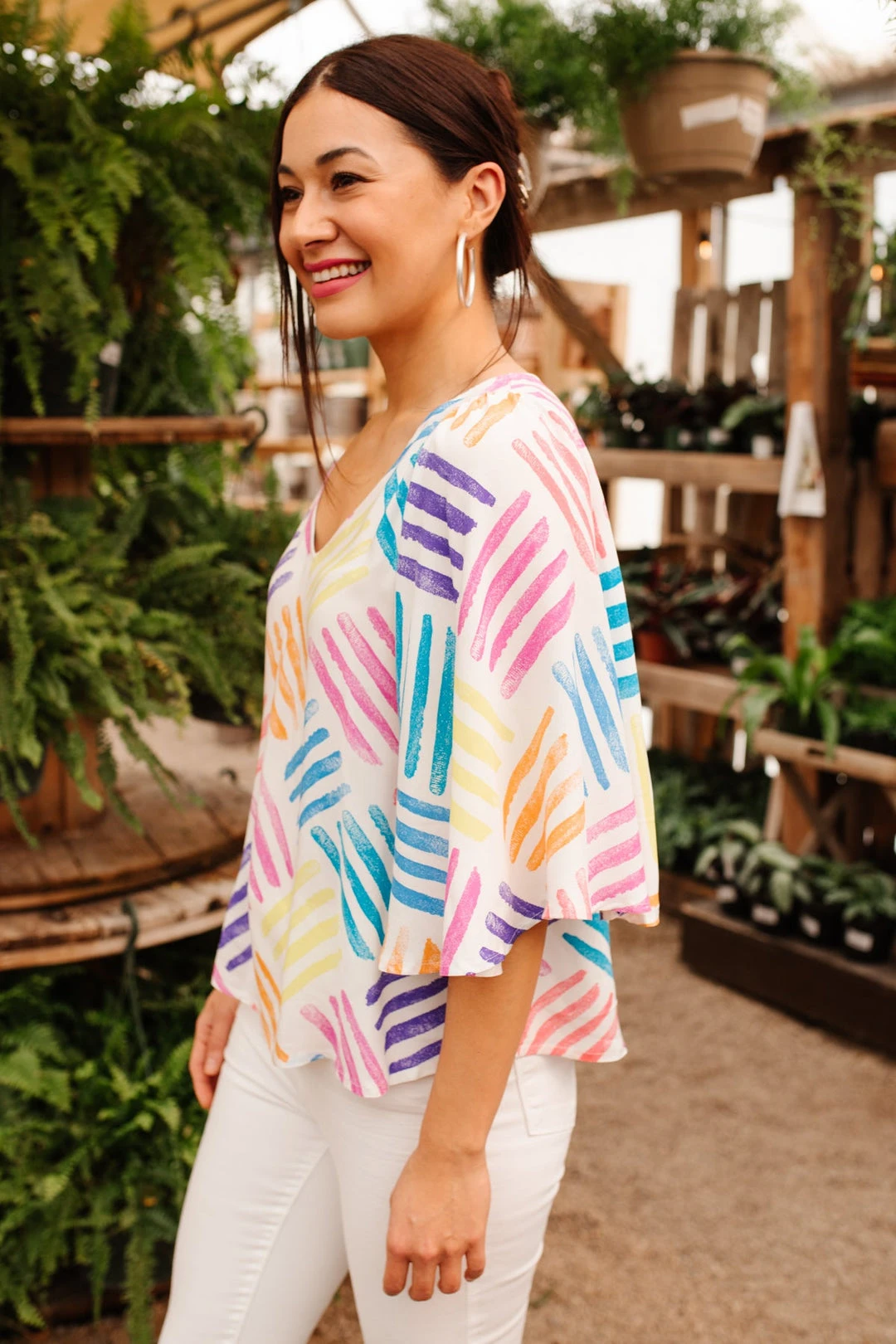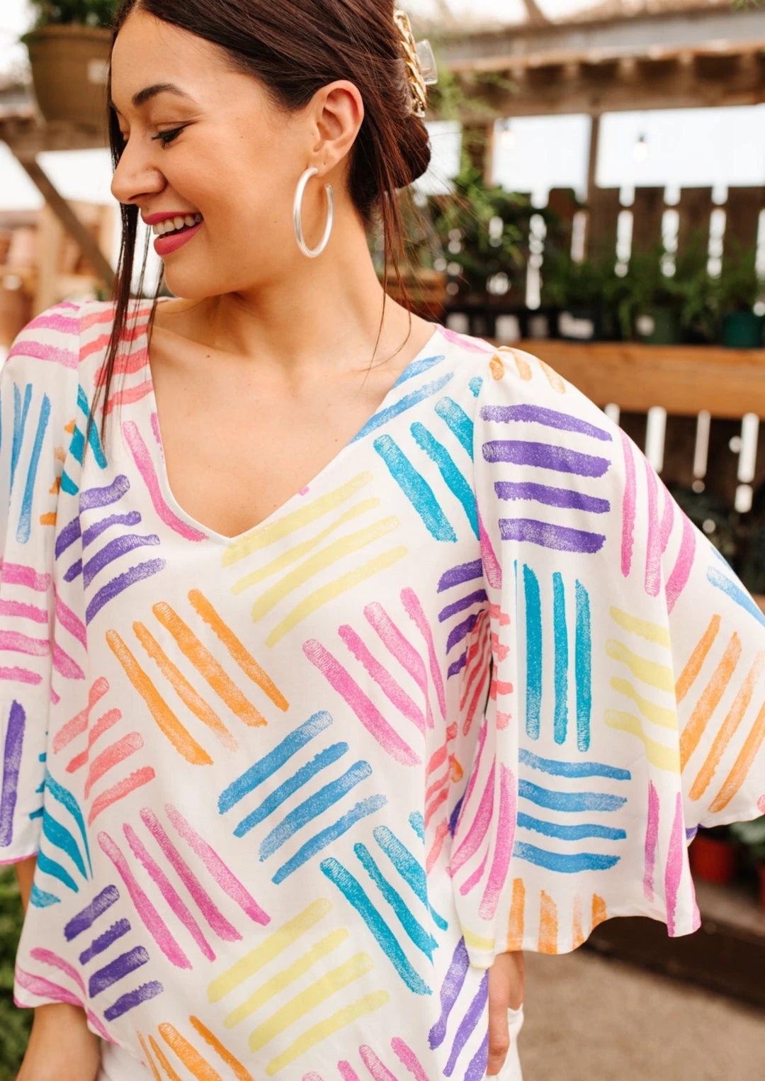 The Stamped By Love Tops is not only chic, but bold and unique! A lightweight rayon fabric makes up a relaxed fit bodice, v-neckline, and three quarter circle sleeve cut. A unique three striped print in pink, orange, blue and yellow decorates this top throughout. Pair with light wash jeans and white sandals for a cute spring fit!
