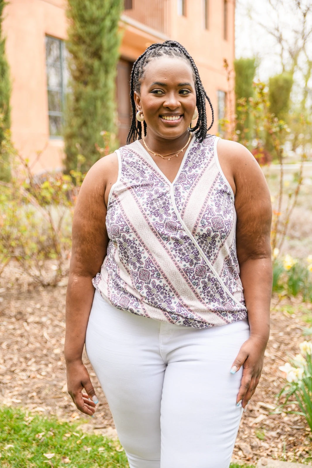 This pink paisley printed top is a unique piece that will instantly update your summer wardrobe. It’s made of incredibly soft material and features wide tank straps and a v-neckline. Style it with denim shorts and a matching clutch for a polished, chic look.