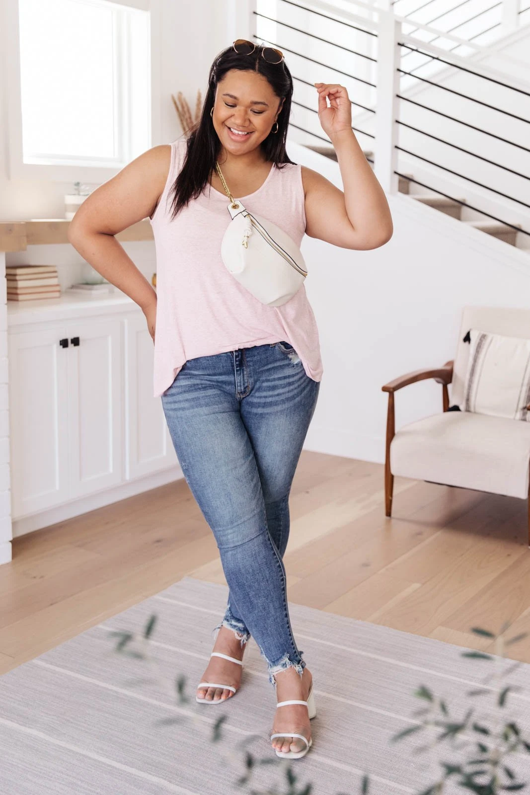 For a wardrobe staple with a feminine touch, look to the Subtle Pink Tank. This simple pink sleeveless top is knit for a semi-relaxed sleeveless silhouette and features a flattering round neckline. Pair it with a simple cardigan for a chic daytime ensemble and don’t forget to add accessories for a bit of sparkle, too.