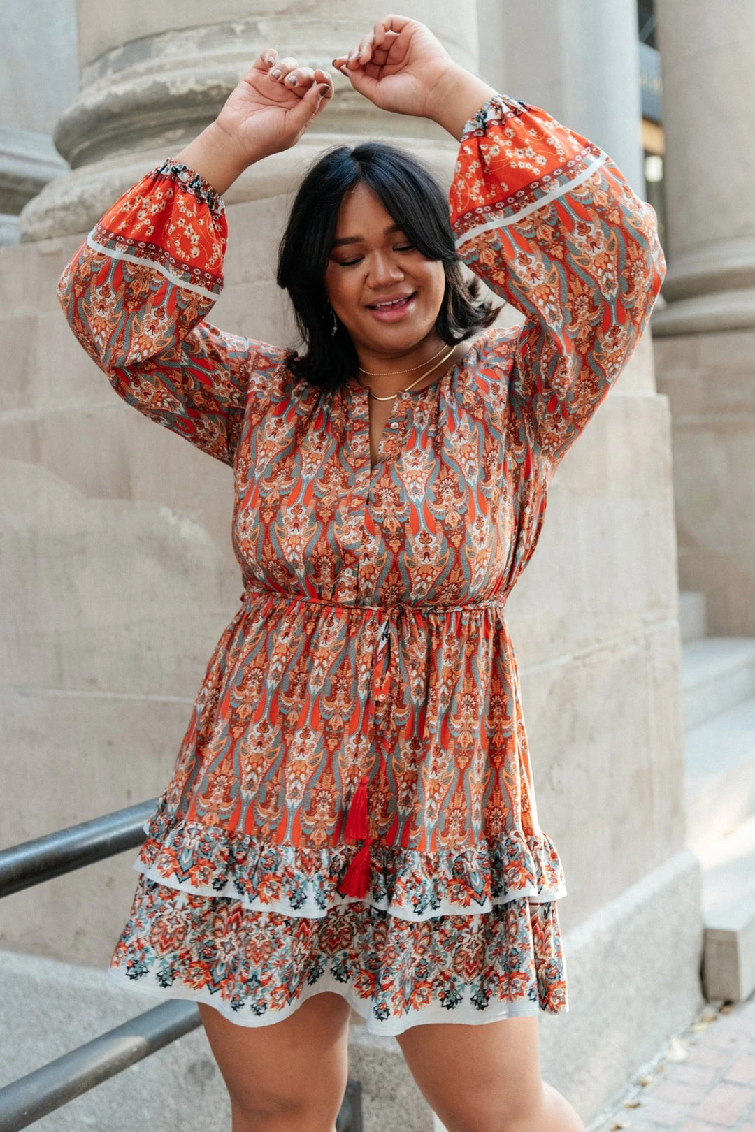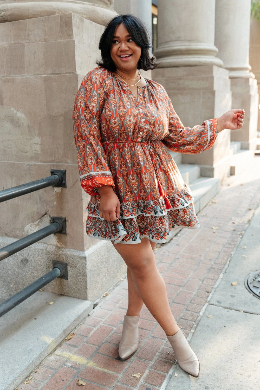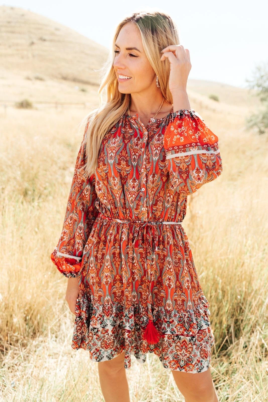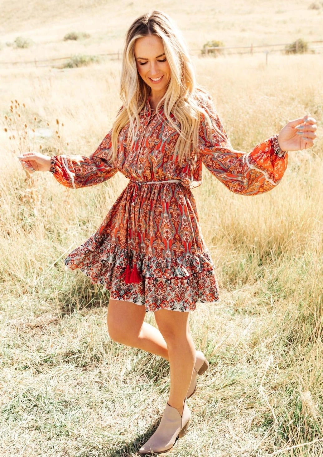 The Sunset Meadow Dress has is made from a color pallet that you’ll be entranced by! This dress has a vintage feel in the muted color tones and swirling patterns. The waist tie and balloon sleeve are just a couple of details that make this dress so special. Pair it with ankle boots and some groovy sunglasses.