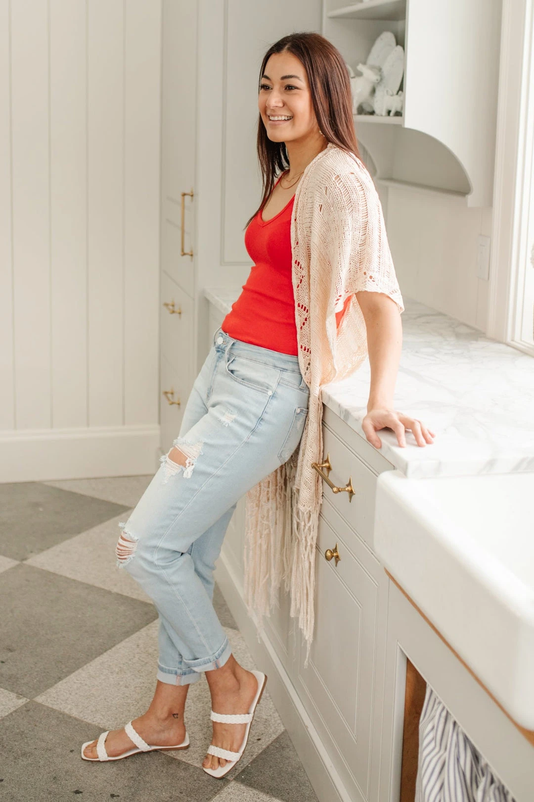 Feeling stuck on what to wear lately? Well the Super Light Destroyed Boyfriend Jeans can fix that issue in a snap! These cute jeans will add everything to your outfit that it’s missing! In a light wash, stretchy denim, with distressing on the knees and thigh, that shape an ankle length, slim fit silhouette, with five pocket cut, zipper fly and belt loops.