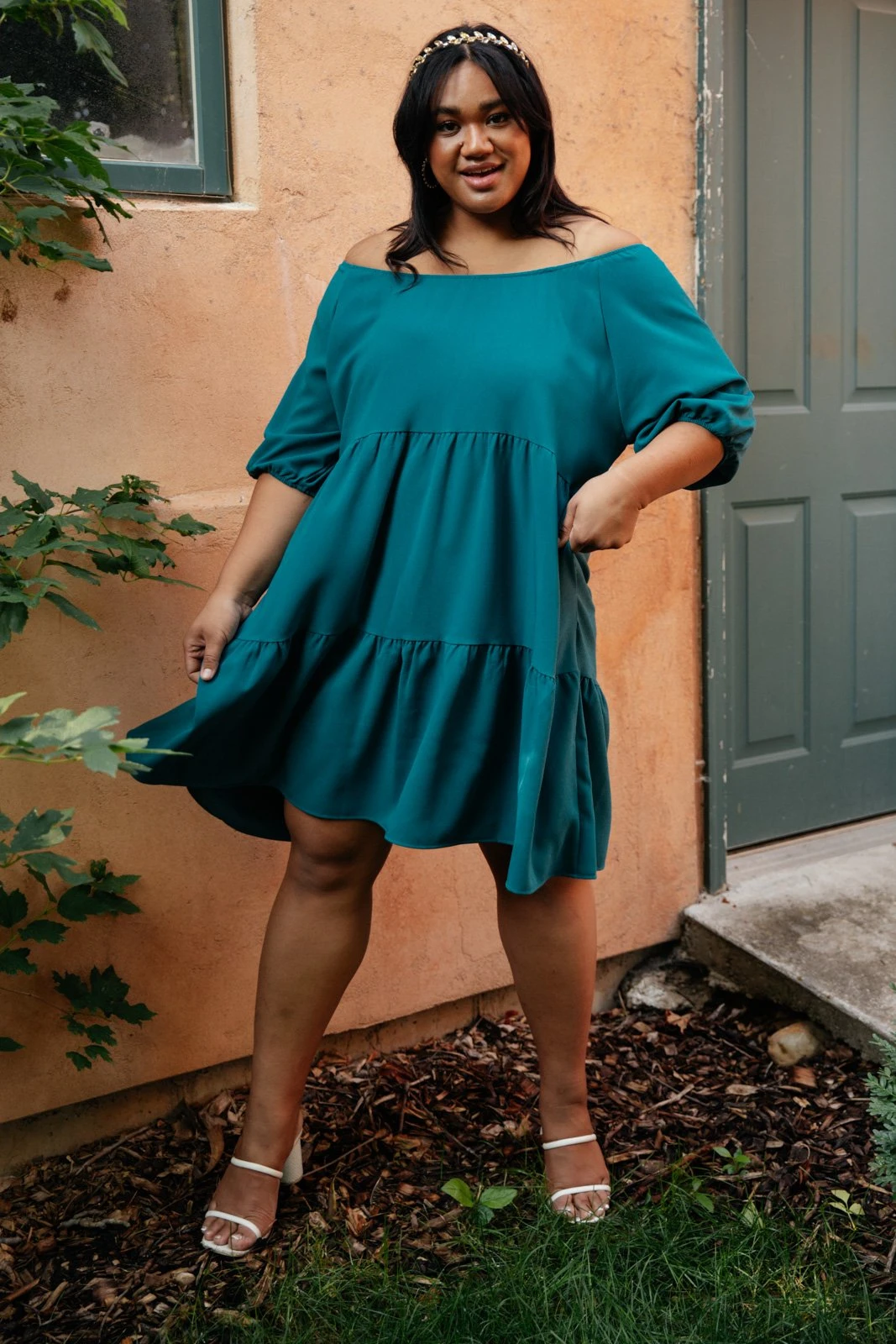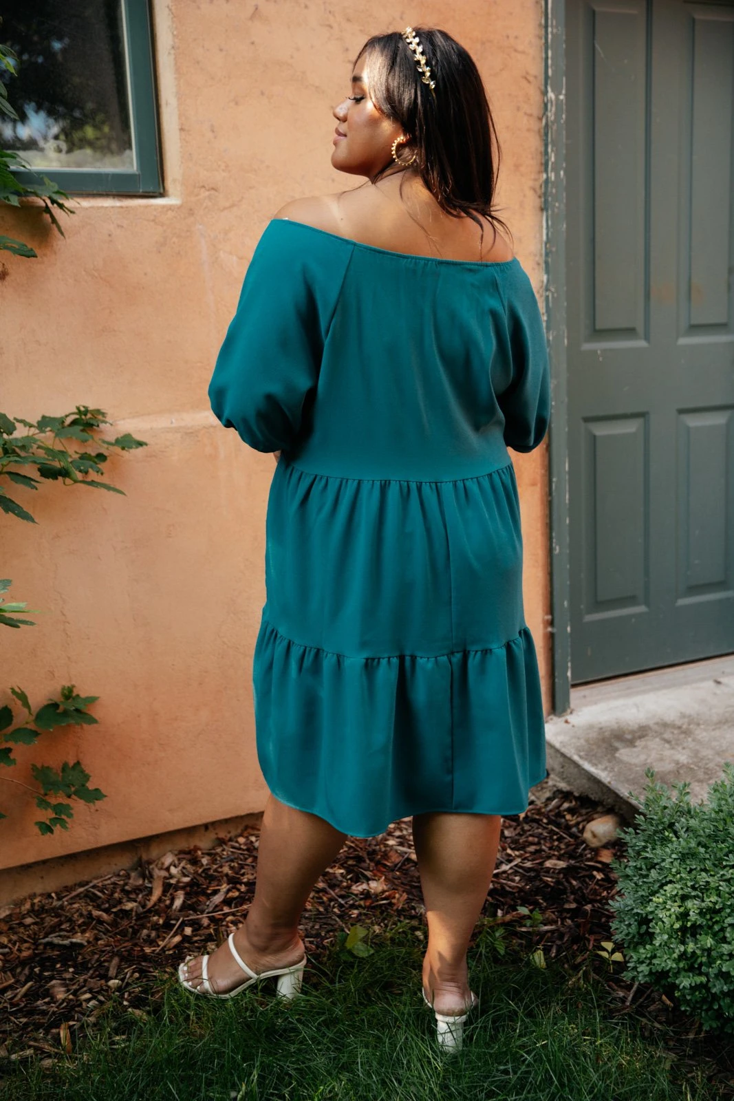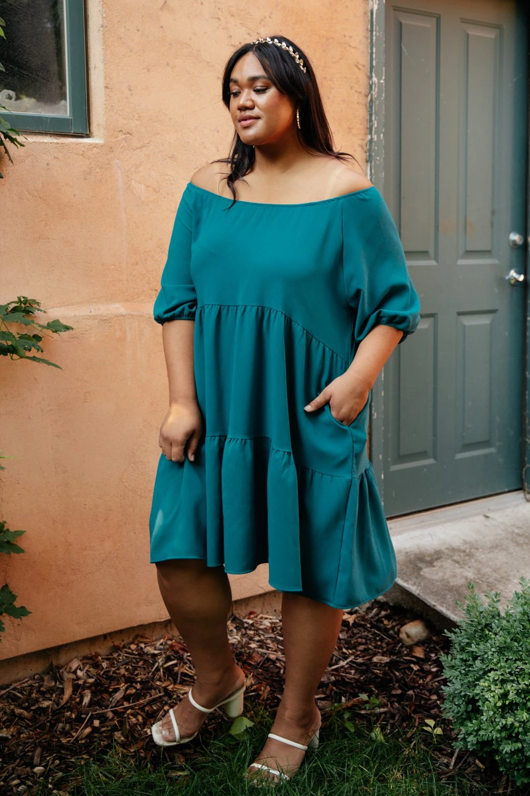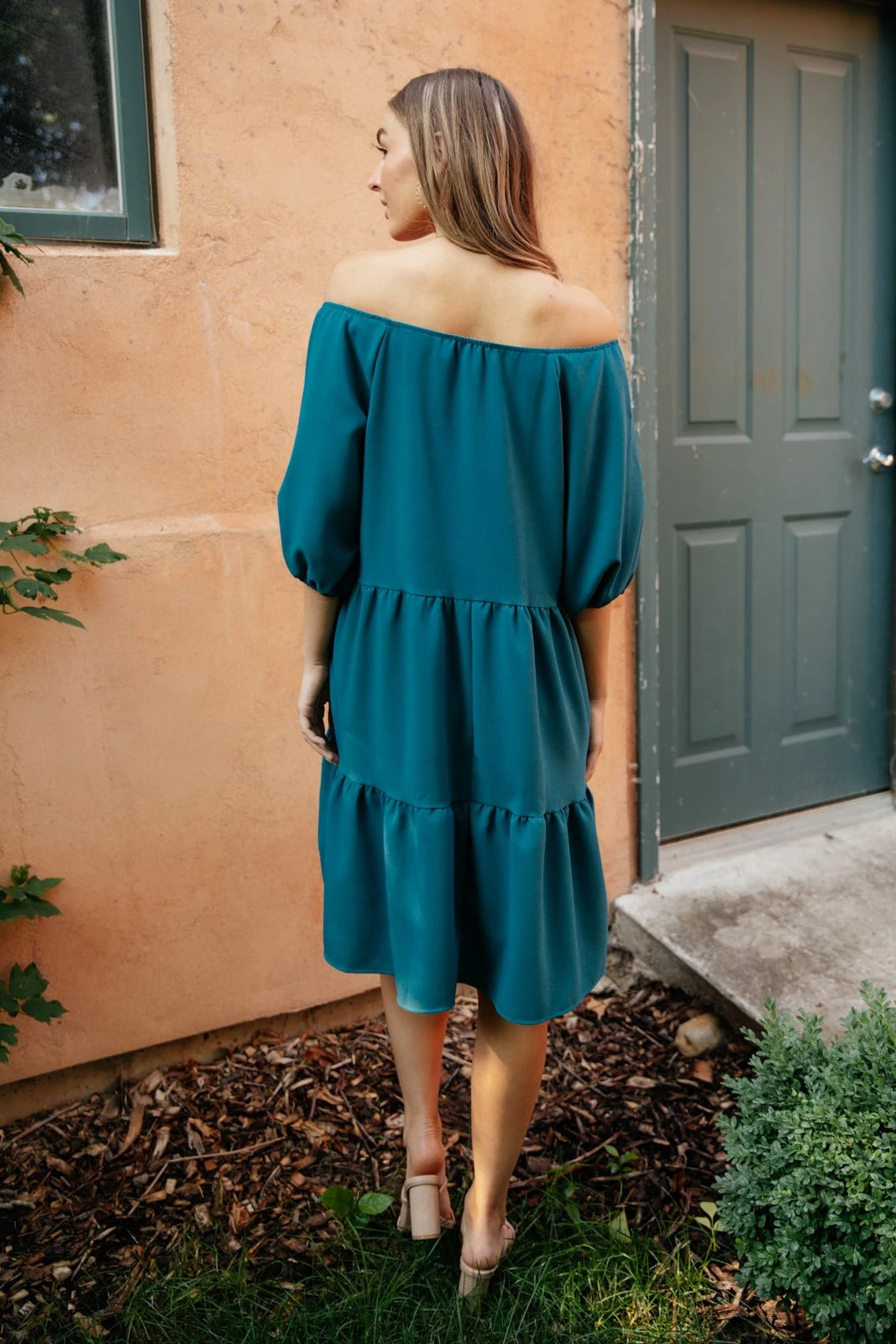 This tiered dress is simply stunning! The wide off the shoulder neckline and 3/4 length puff sleeve are so unique, and the tiered skirt creates beautiful movement when you walk. Pair this dress with a beautiful statement necklace.