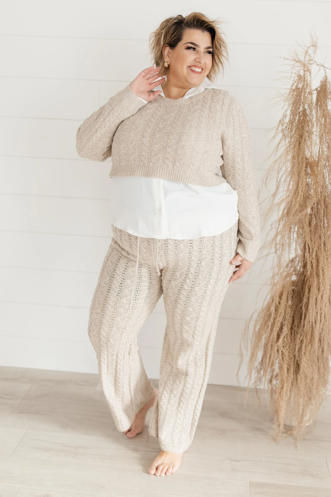 This cable knit lounge set is so cute and ultra-trendy! This top is medium weight and ultra cropped! It features a rounded neckline and long sleeves! This sweater looks perfect paired with matching lounge pants or with a cute pair of high-waisted jeans.