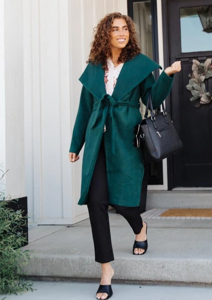 The Paislynn Trench Coat is a stylish, extravagant, chic coat that is a stunning deep hunter green color! It feels so festive and upscale. It’s heavyweight, so it’ll keep you warm and looking so trendy. It also features an adjustable tie detail at the waist.