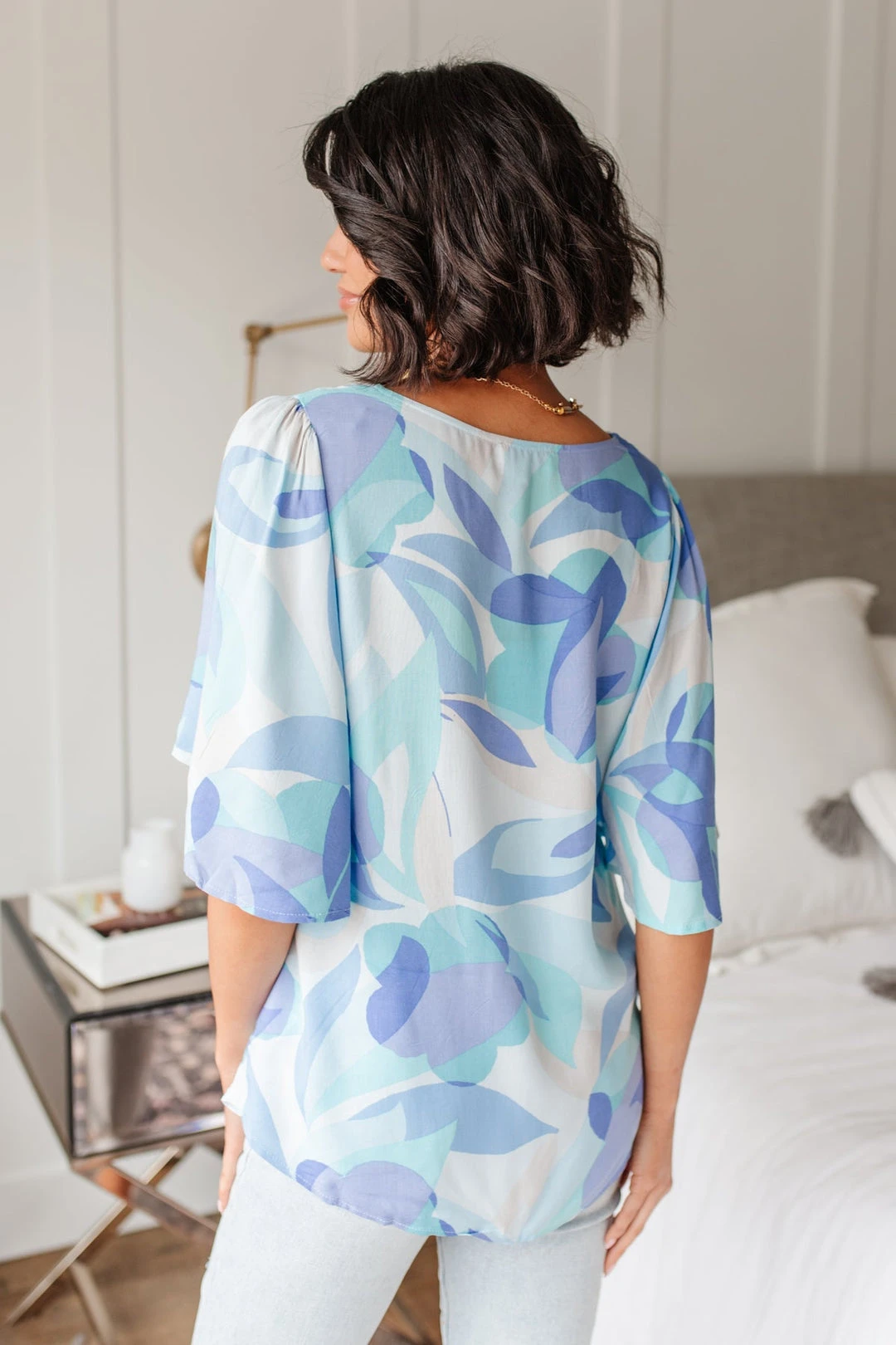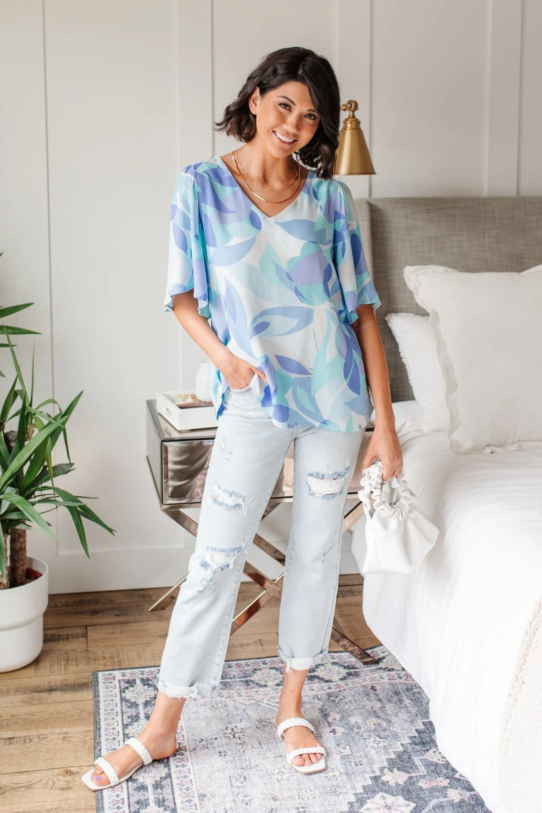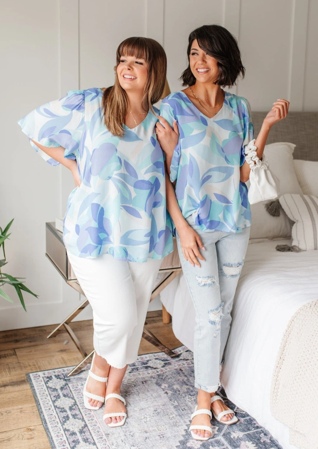 The Tropics Top has us craving the summer sun! This refreshing, colorful top features a v-neckline, flared circle sleeves, and a cool abstract leaf print all over. Pair this cute top with white denim and nude sandals for a darling summer look!