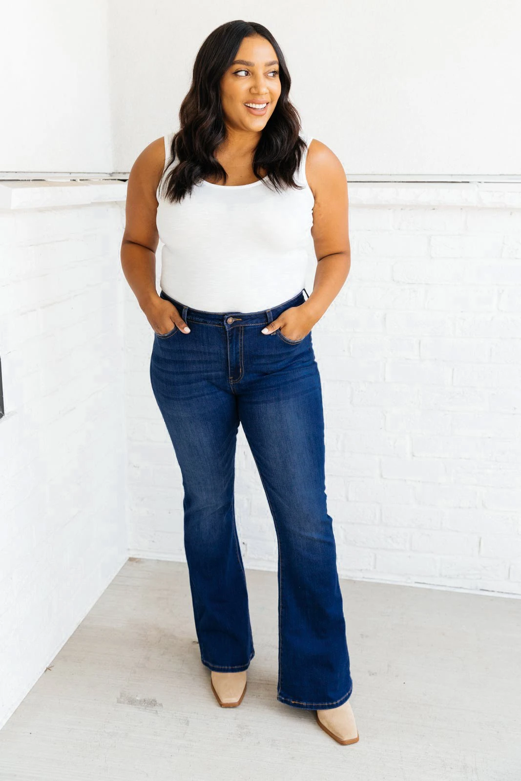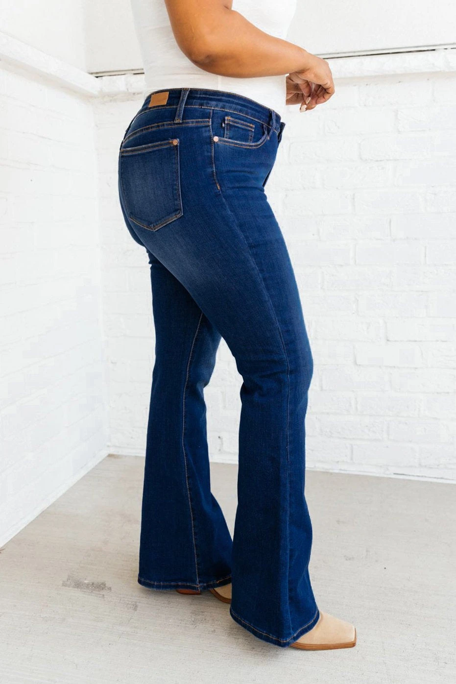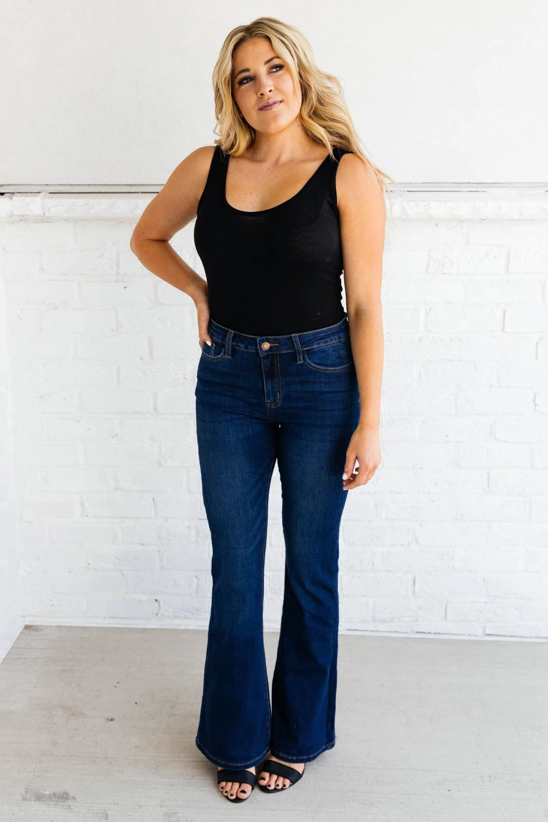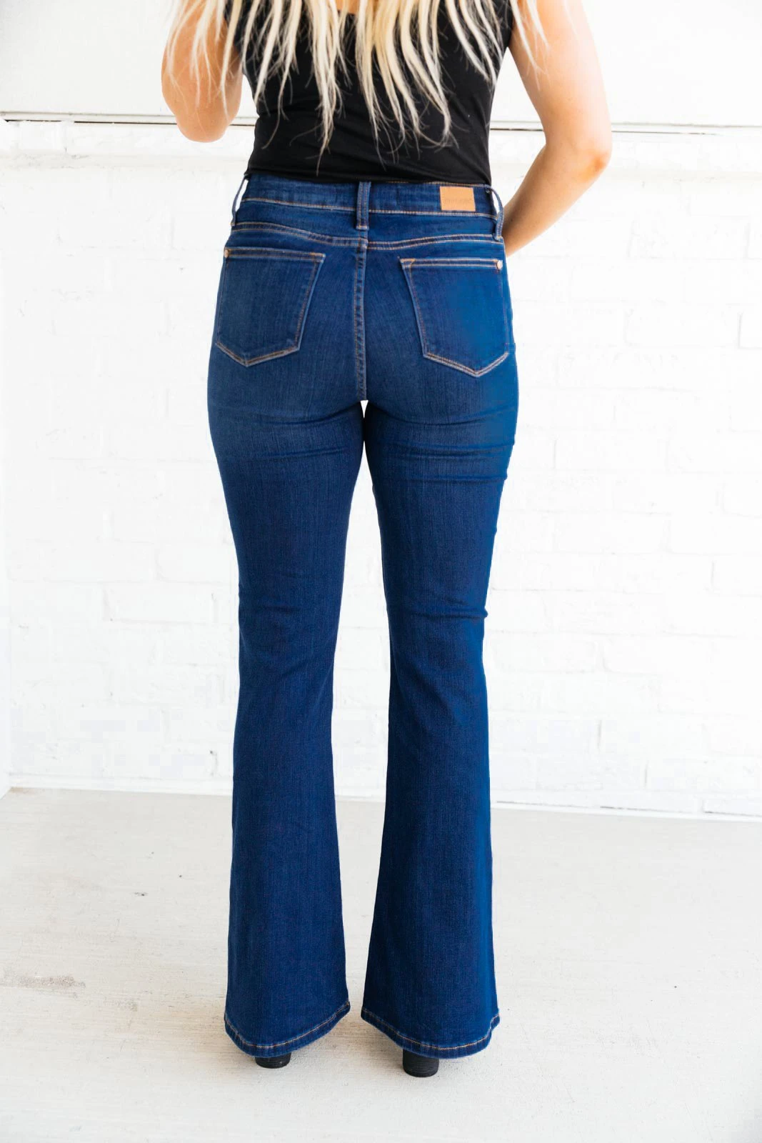 The Throwback Flare Jeans are a deep blue, flared jean with a high rise waist.
