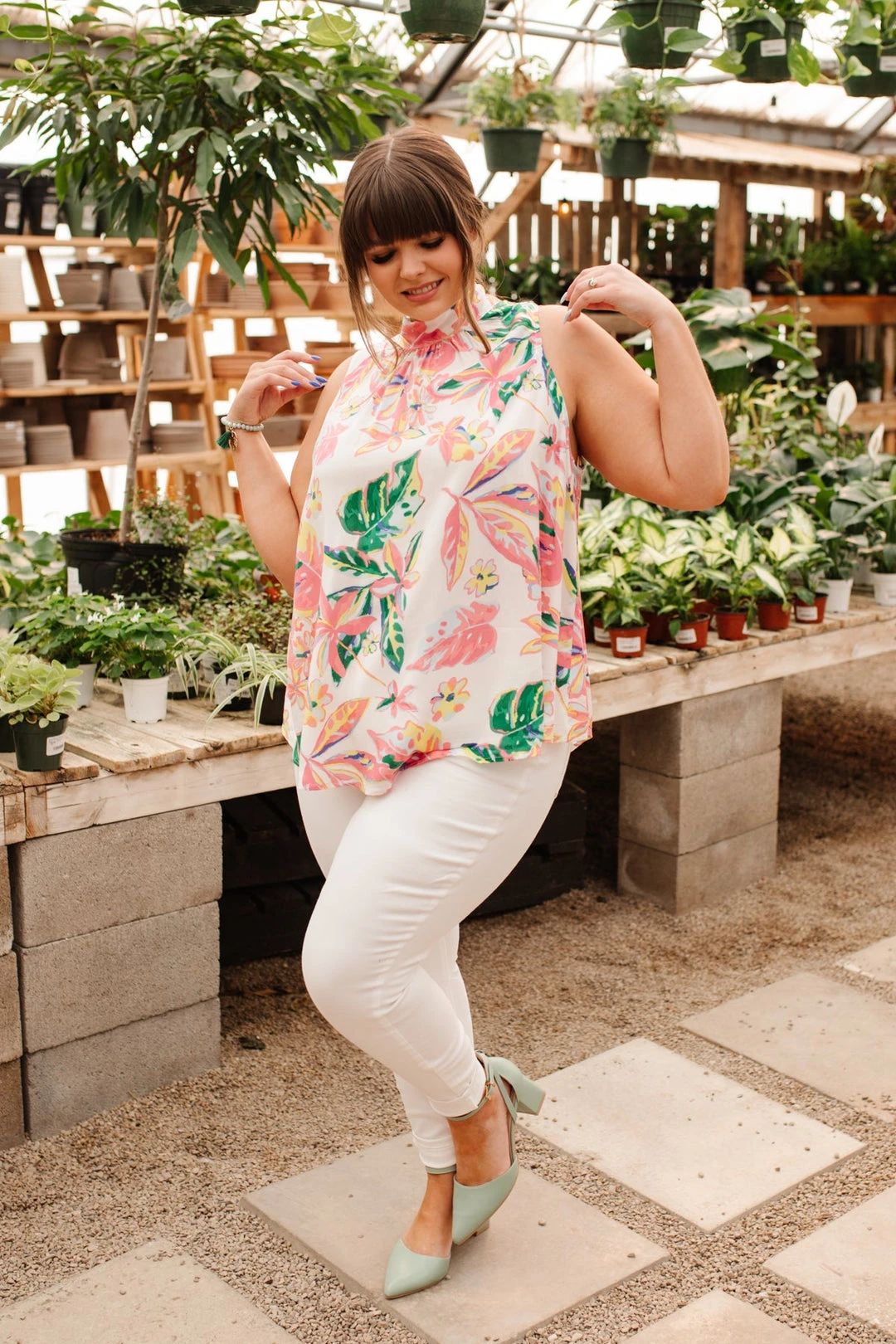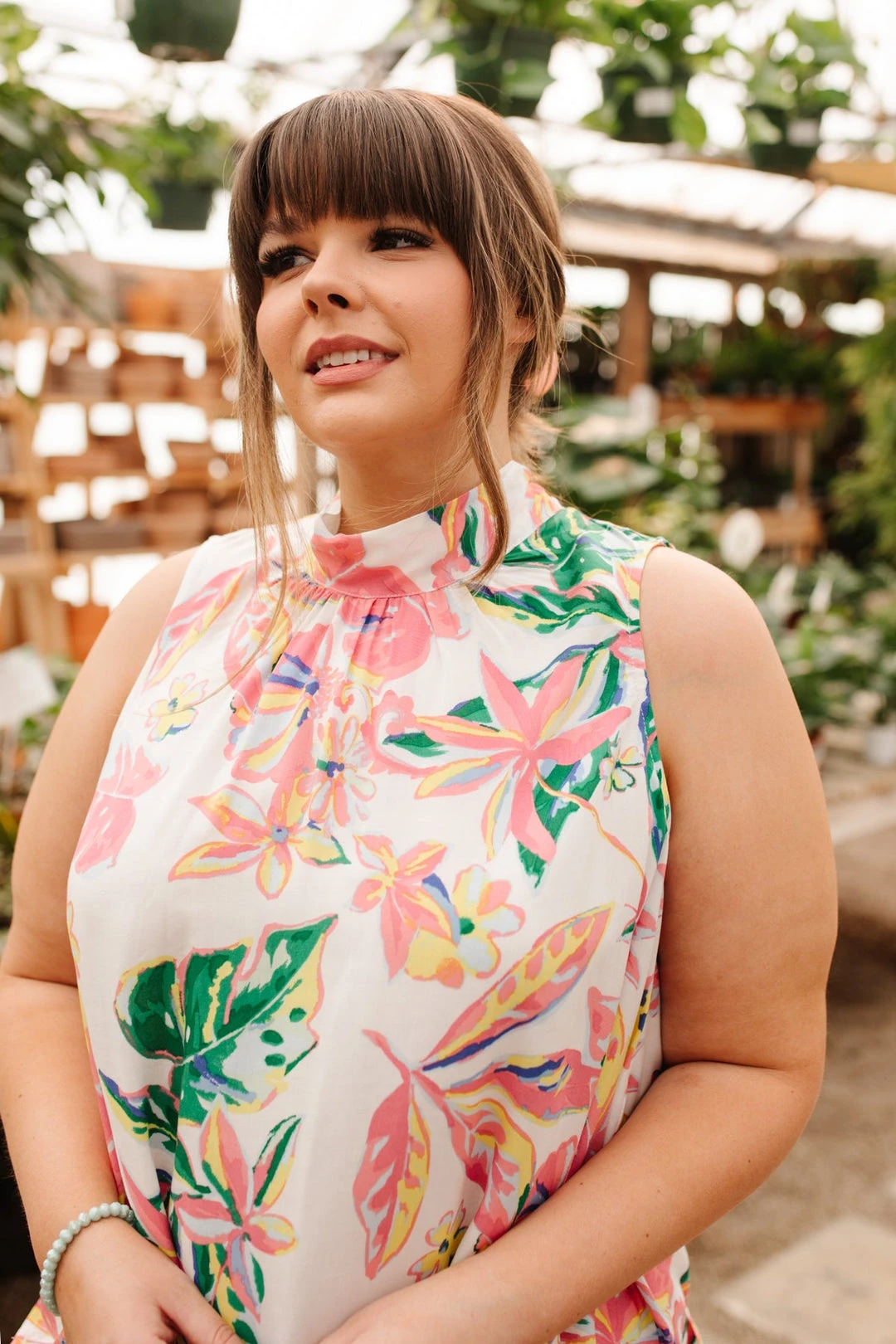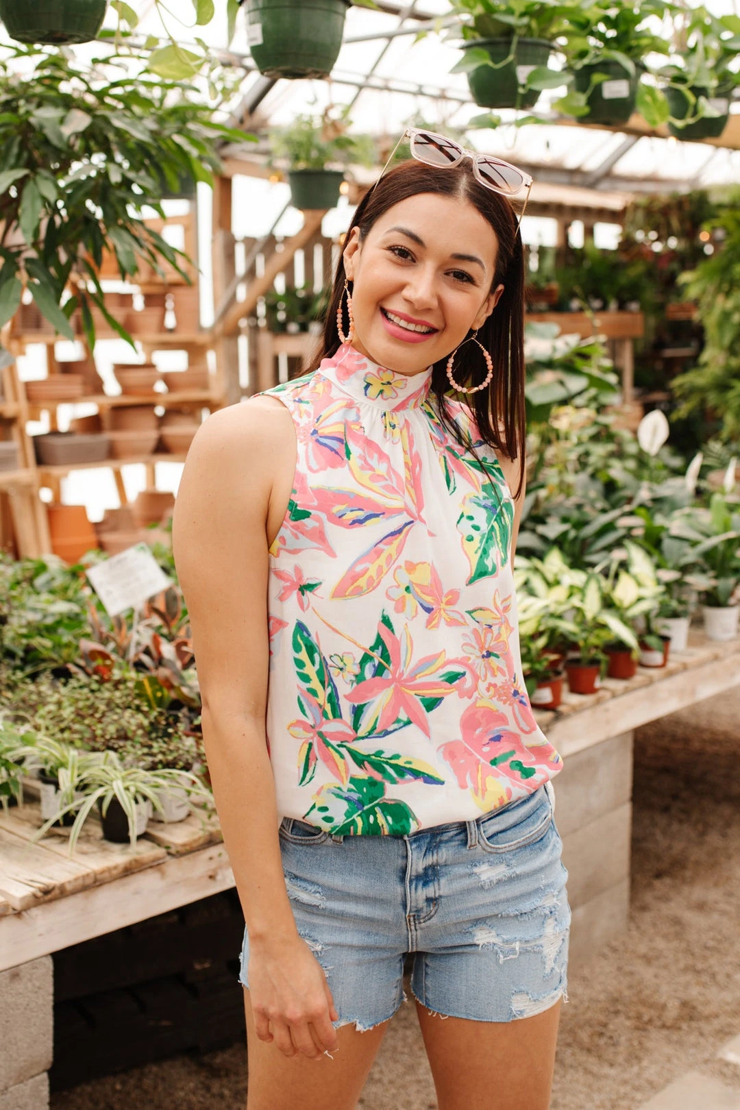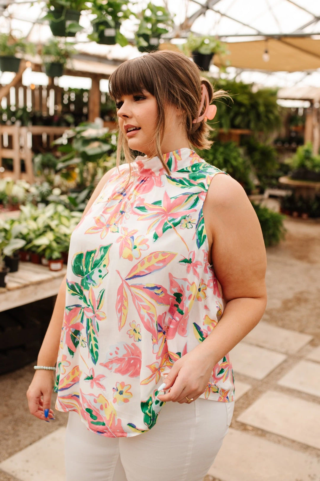 Create the perfect vacay look in the Tropical Rain Sleeveless Top! A lightweight flowy fabric, shapes an a-line silhouette, with a sleeveless cut and mock neck-line. Style this top with white jeans, nude sandals, sunnies, and a bag for the cutest vacation day look!