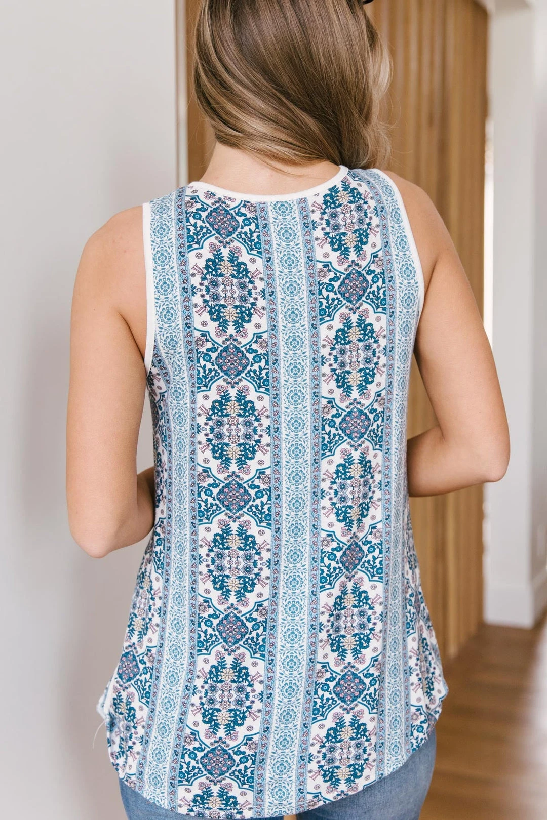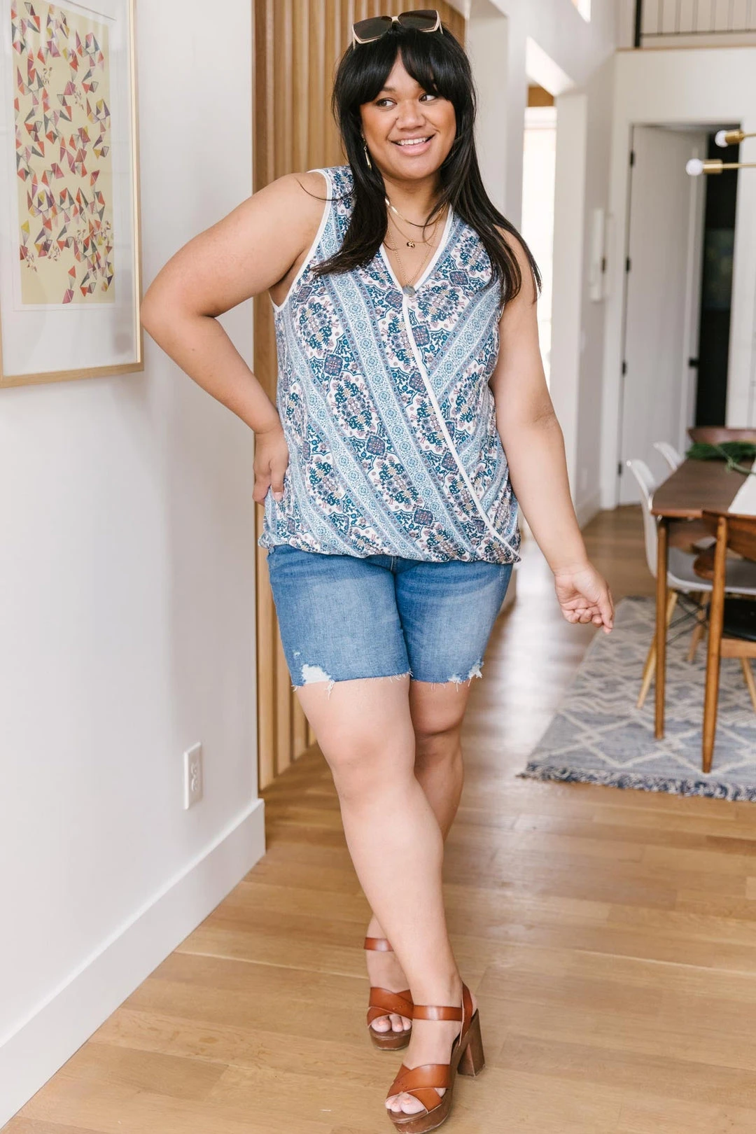 This blue paisley printed top is a unique piece that will instantly update your summer wardrobe. It’s made of incredibly soft material and features wide tank straps and a v- neckline. Style it with denim shorts and a matching clutch for a polished, chic look.
