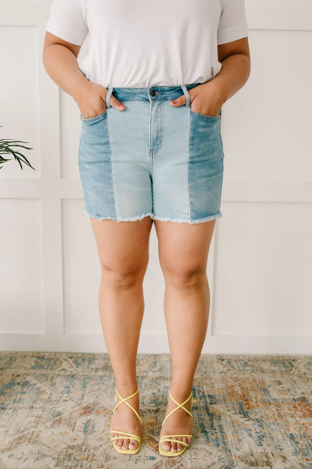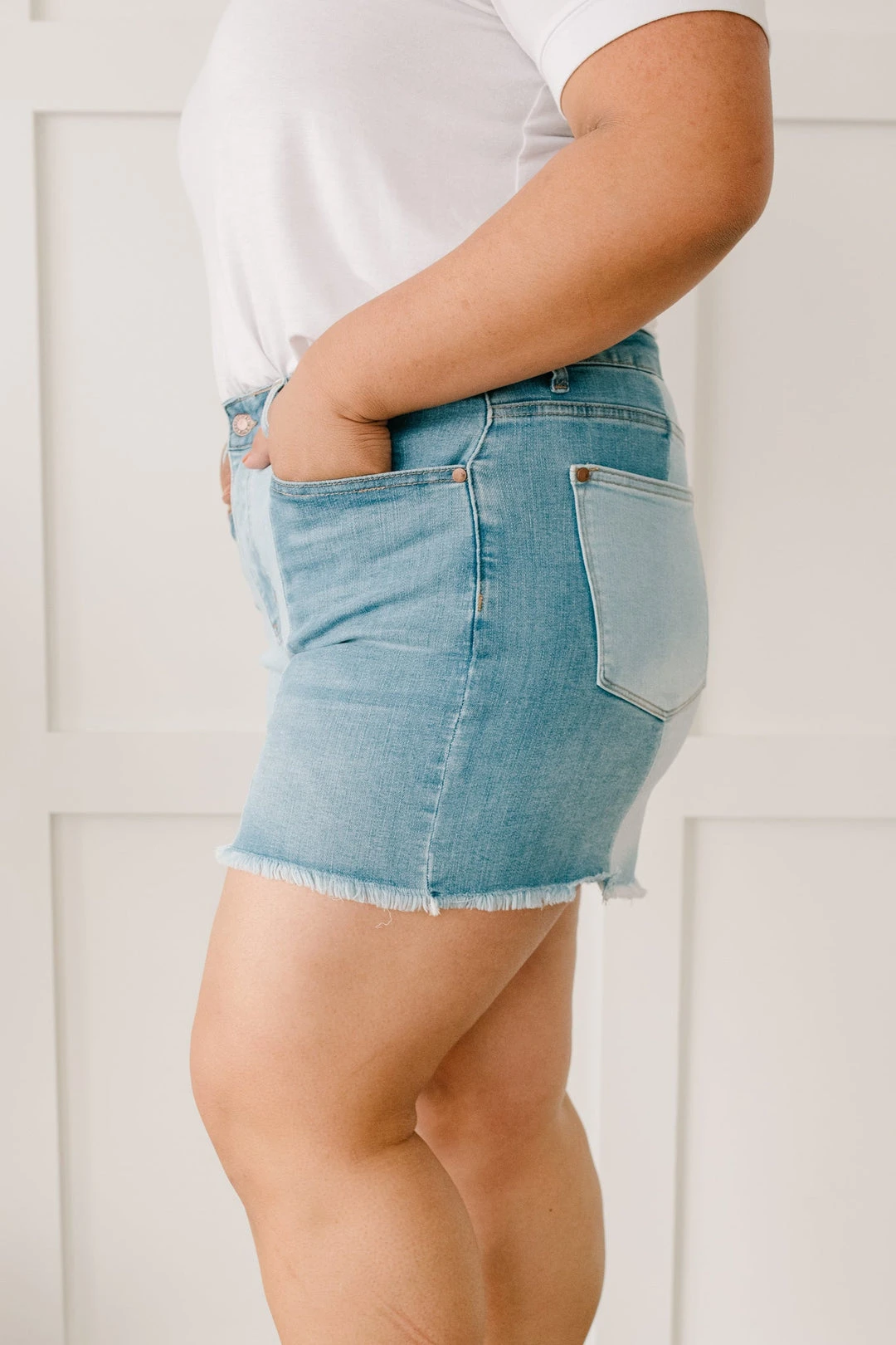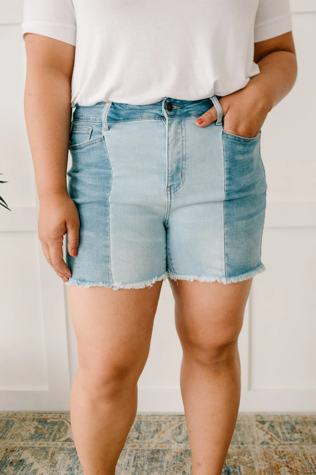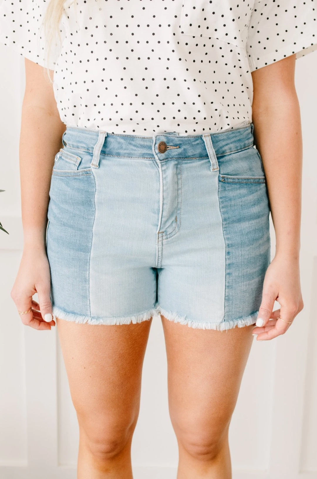 Struggle to decide what to wear in the morning? These shorts will be the perfect solution for you. You don’t have to choose between washes as these two-toned shorts feature medium and light-wash strips of fabric. The center seams are such a statement and will guarantee compliments every time you wear these!