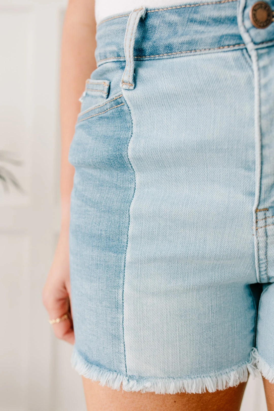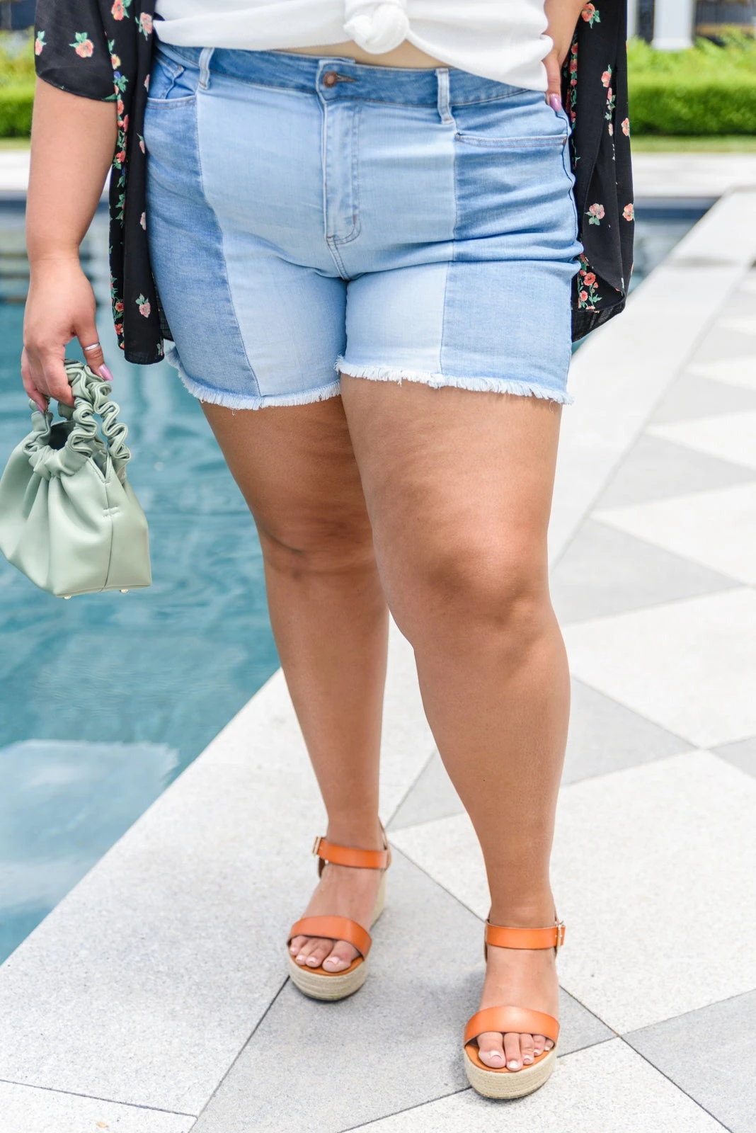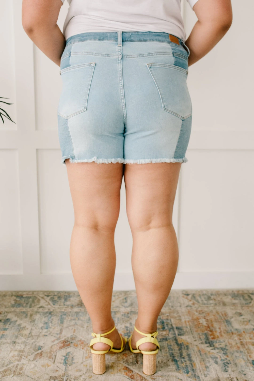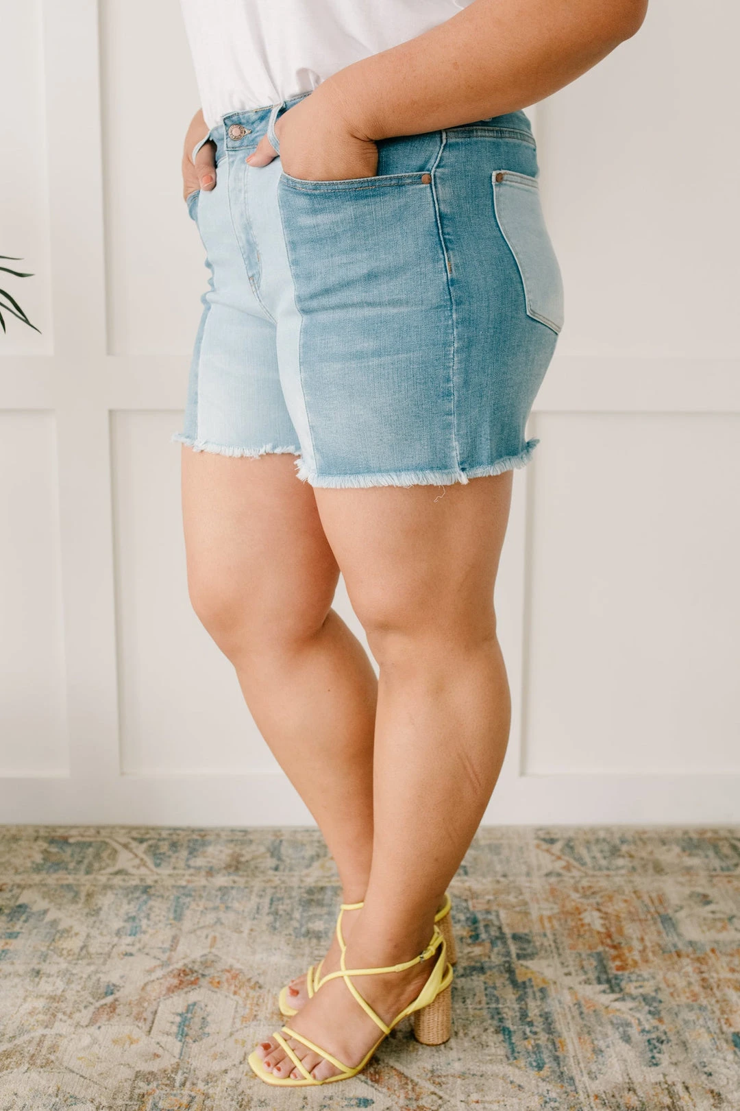 Struggle to decide what to wear in the morning? These shorts will be the perfect solution for you. You don’t have to choose between washes as these two-toned shorts feature medium and light-wash strips of fabric. The center seams are such a statement and will guarantee compliments every time you wear these!