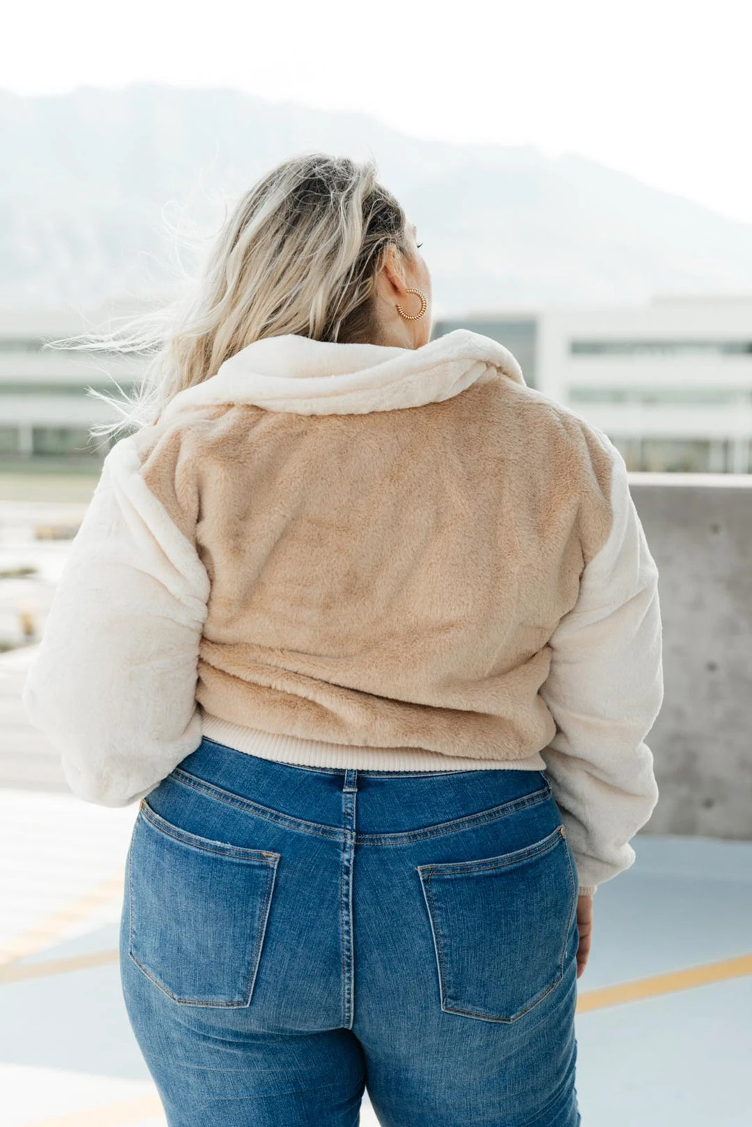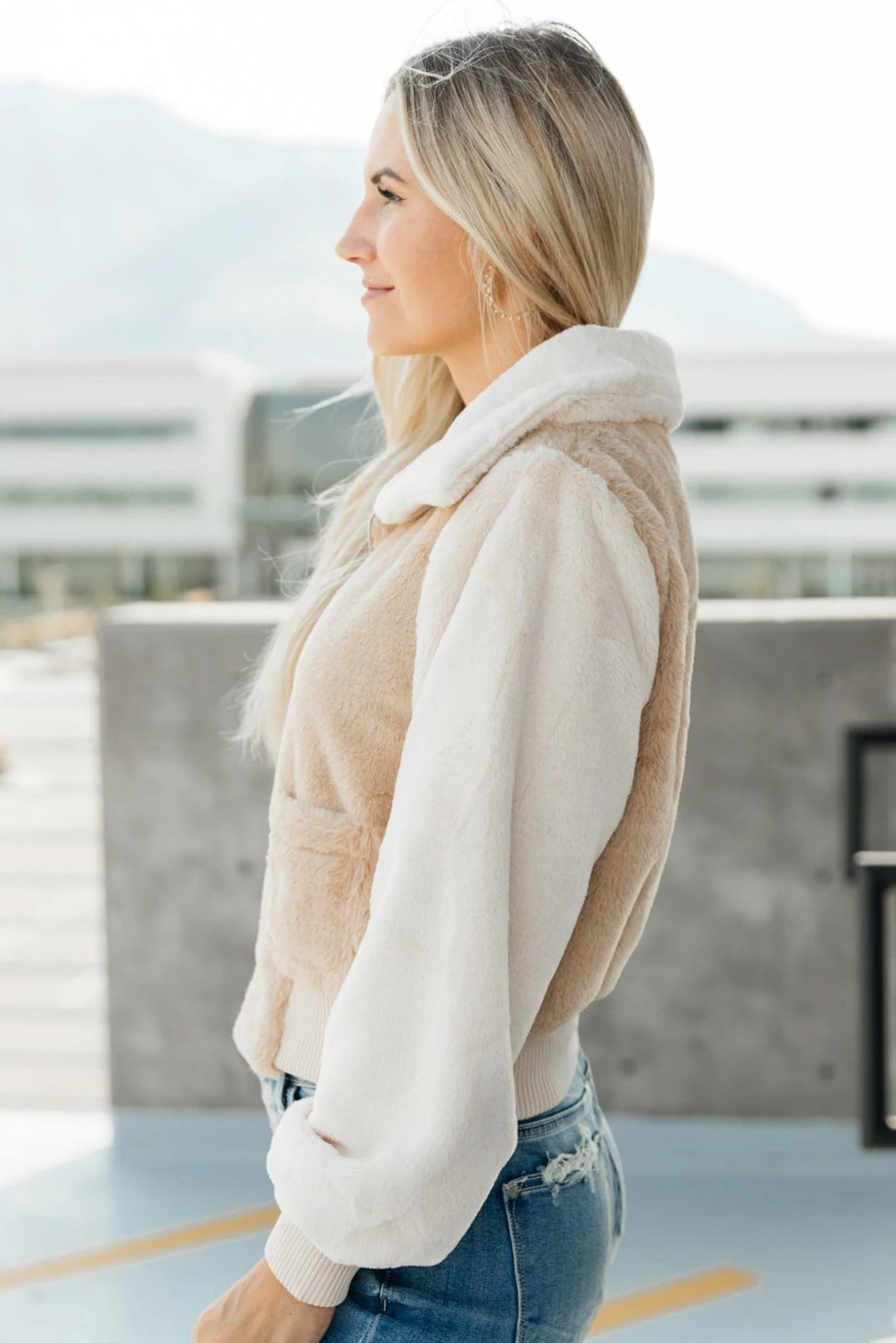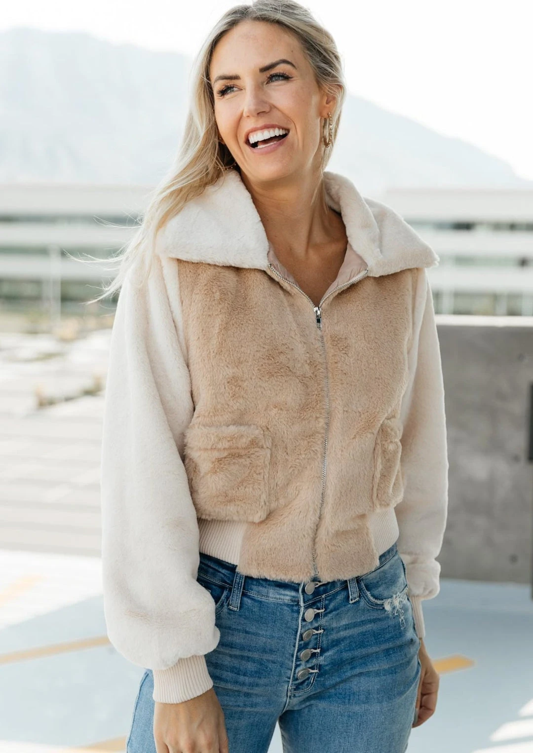 The Two Toned Teddy Bear Jacket is made of soft tan and cream fabric. We love the oversized collar and cuffed sleeves! Pair this jacket with jeans and a layering tank or blouse.
