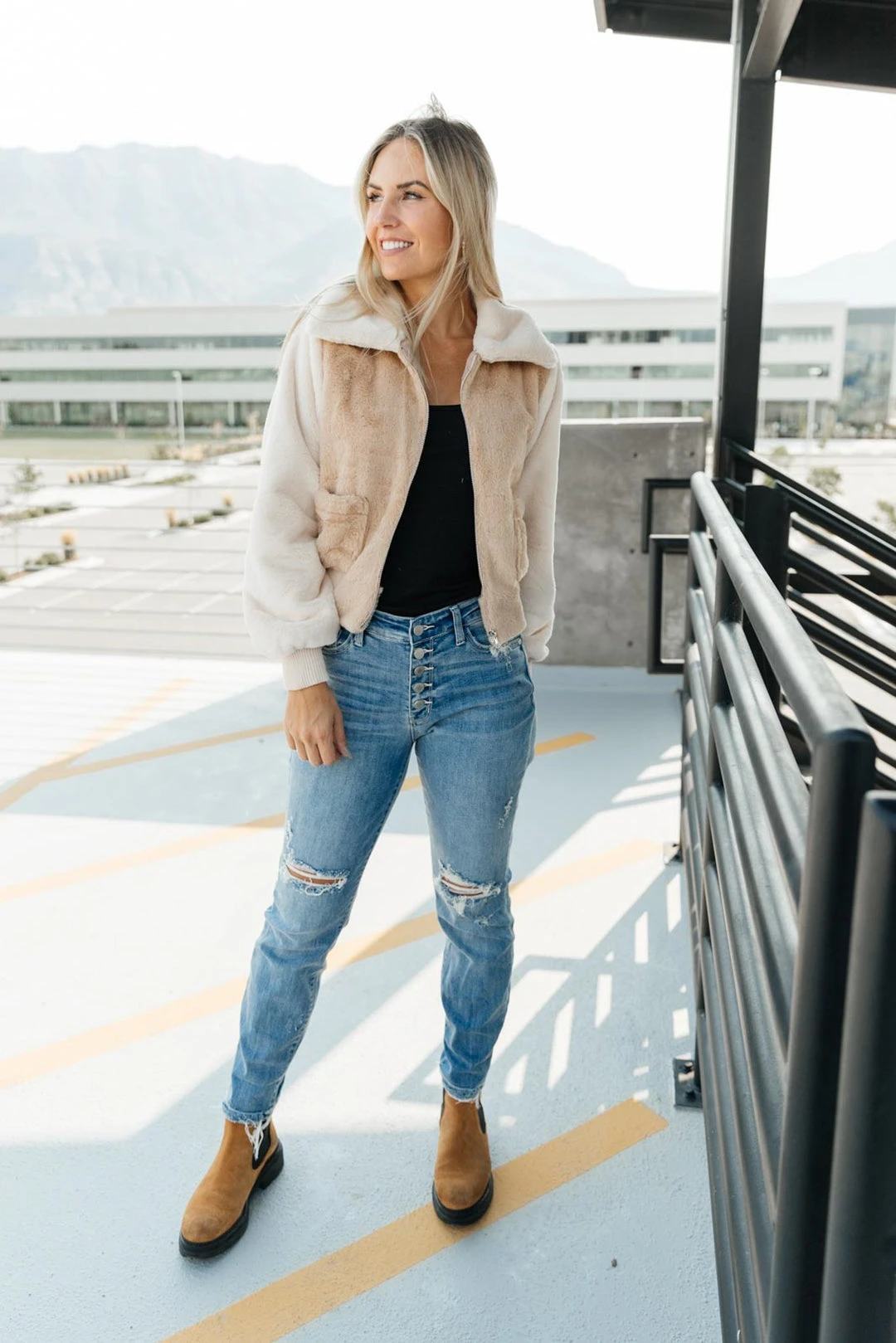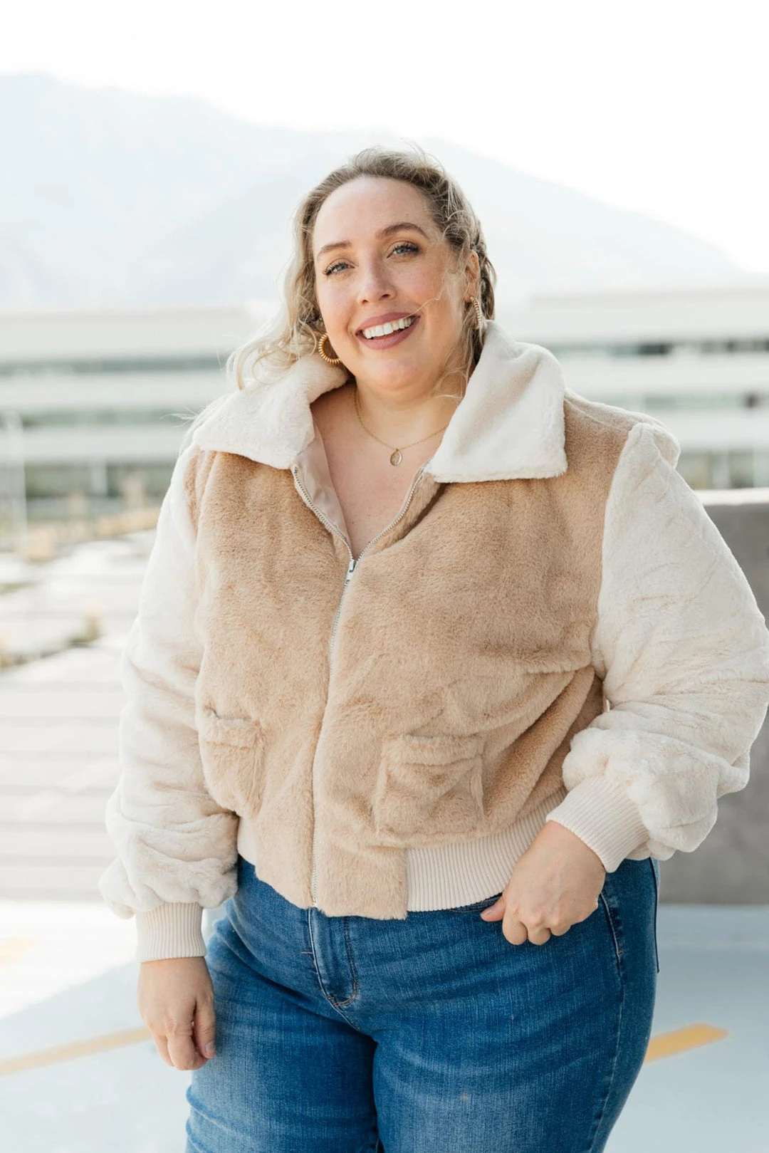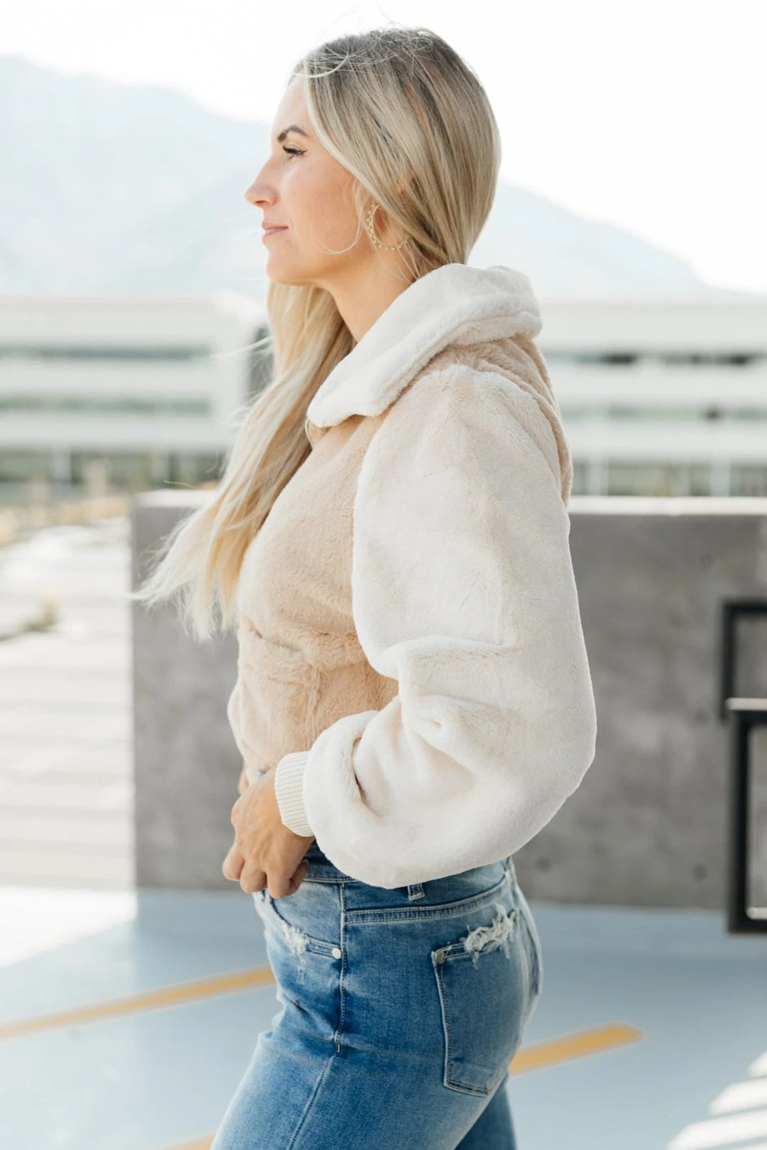The Two Toned Teddy Bear Jacket is made of soft tan and cream fabric. We love the oversized collar and cuffed sleeves! Pair this jacket with jeans and a layering tank or blouse.