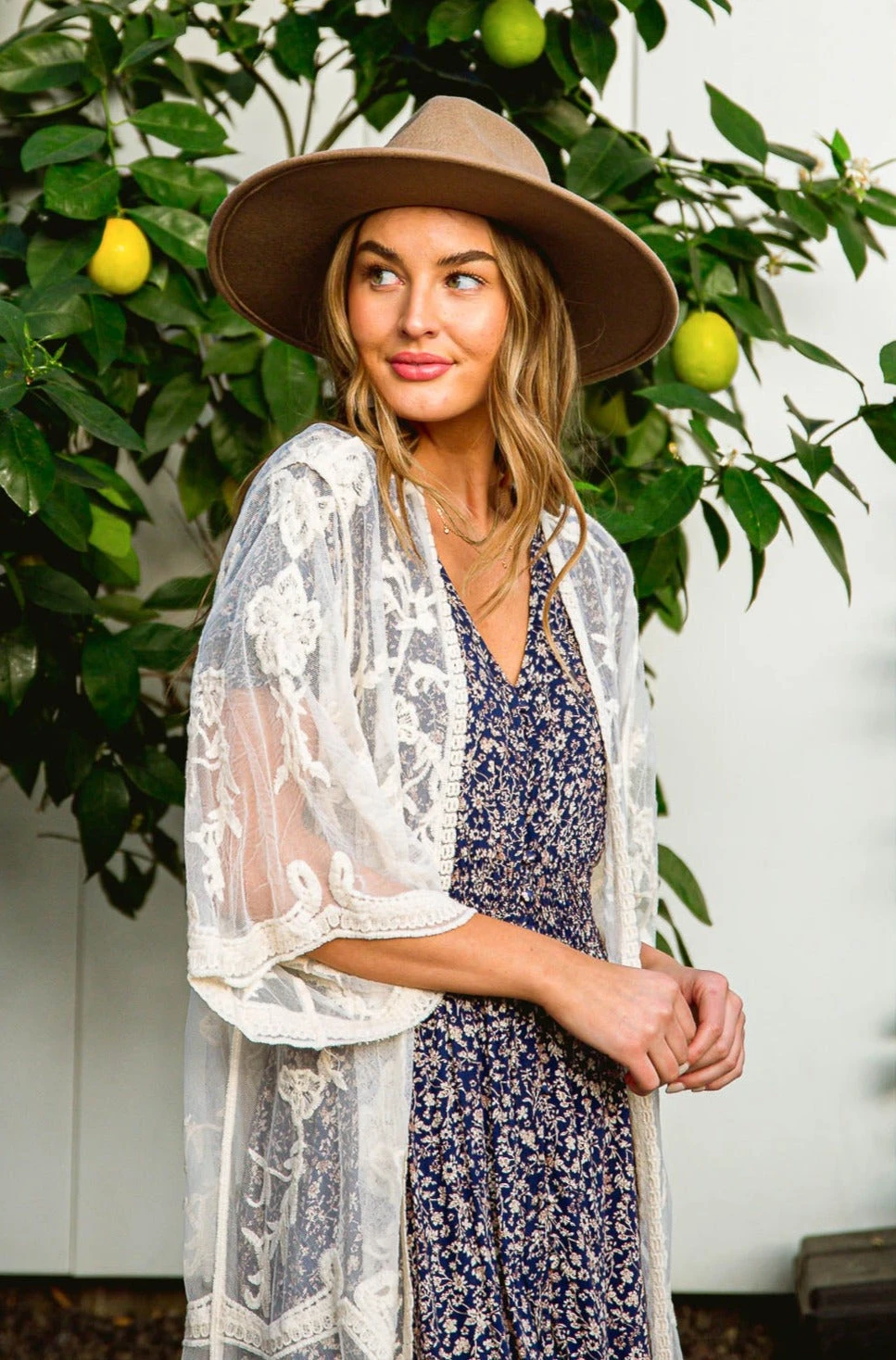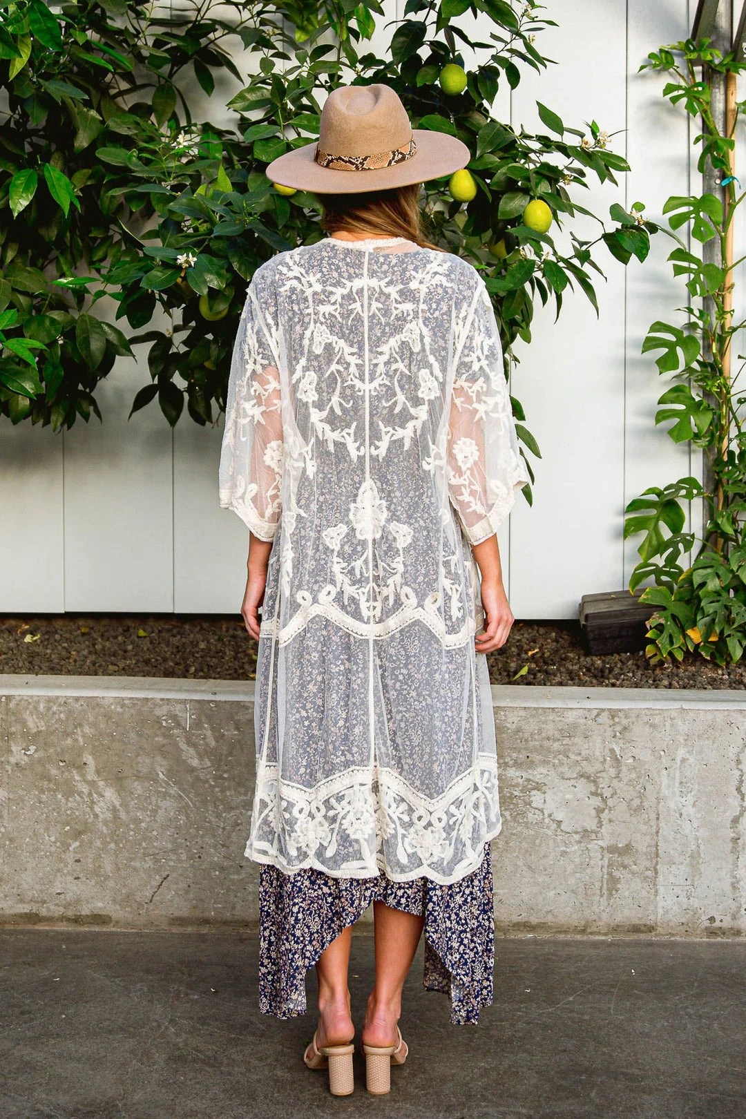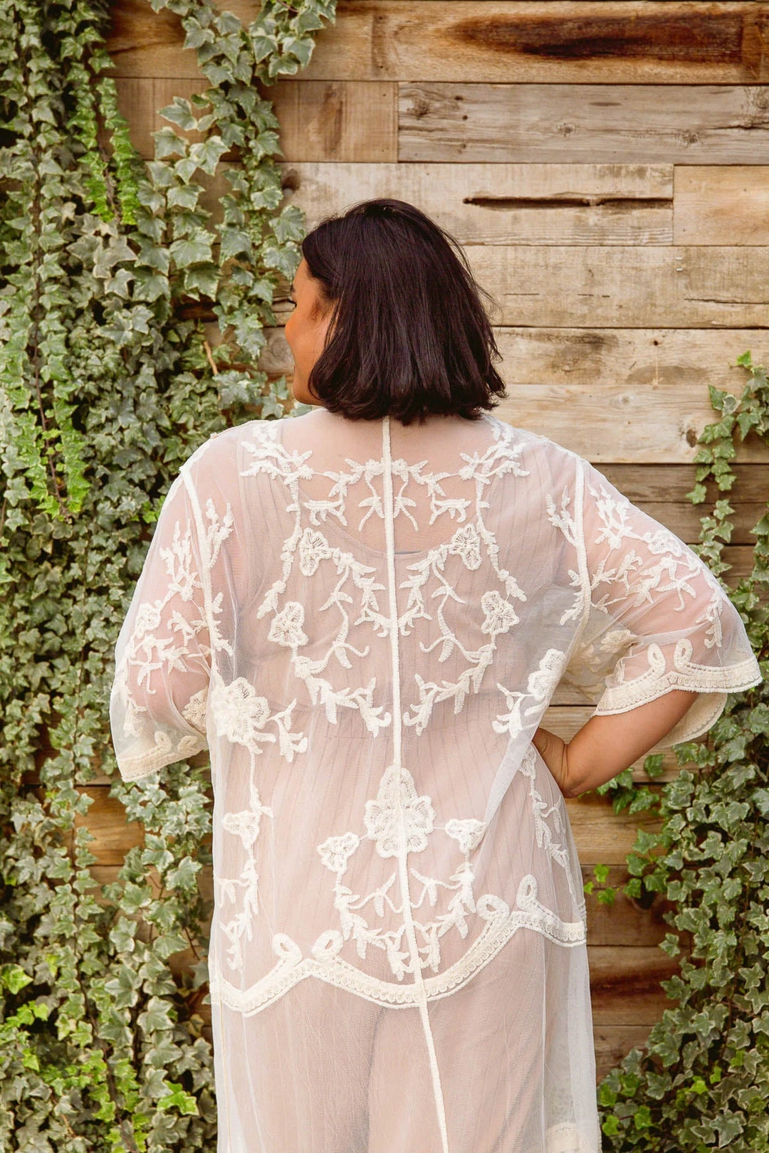 We are craving a trip to Greece in the Vacay Babe Cardigan. Perfect for roaming the streets and a day at the beach. In a mesh fabric with lace flower overlay this beautiful cardigan will pair well over dresses, swimsuits, and shorts!