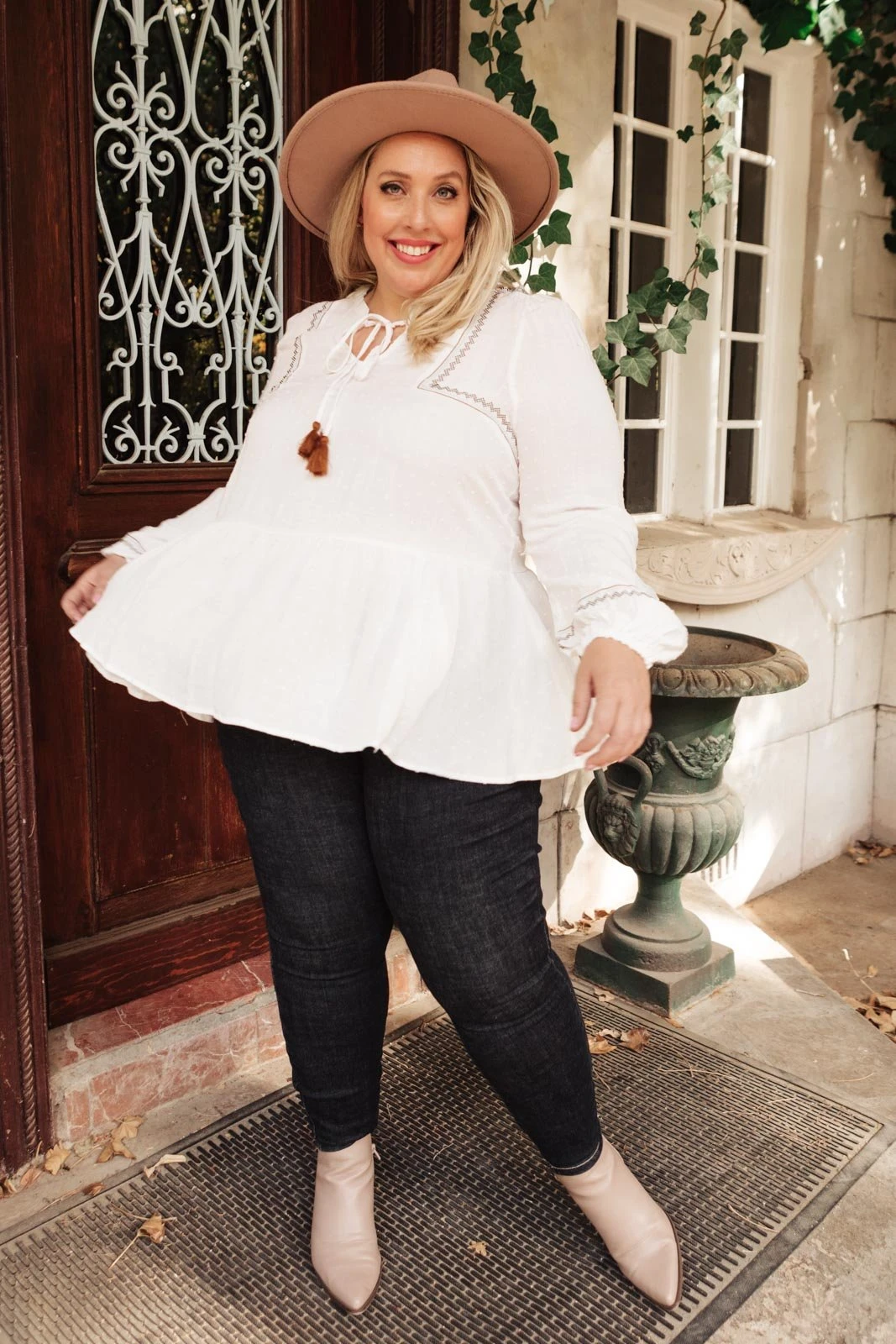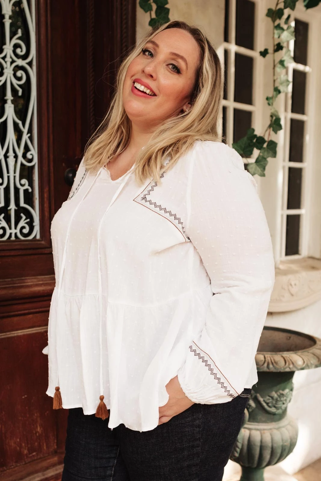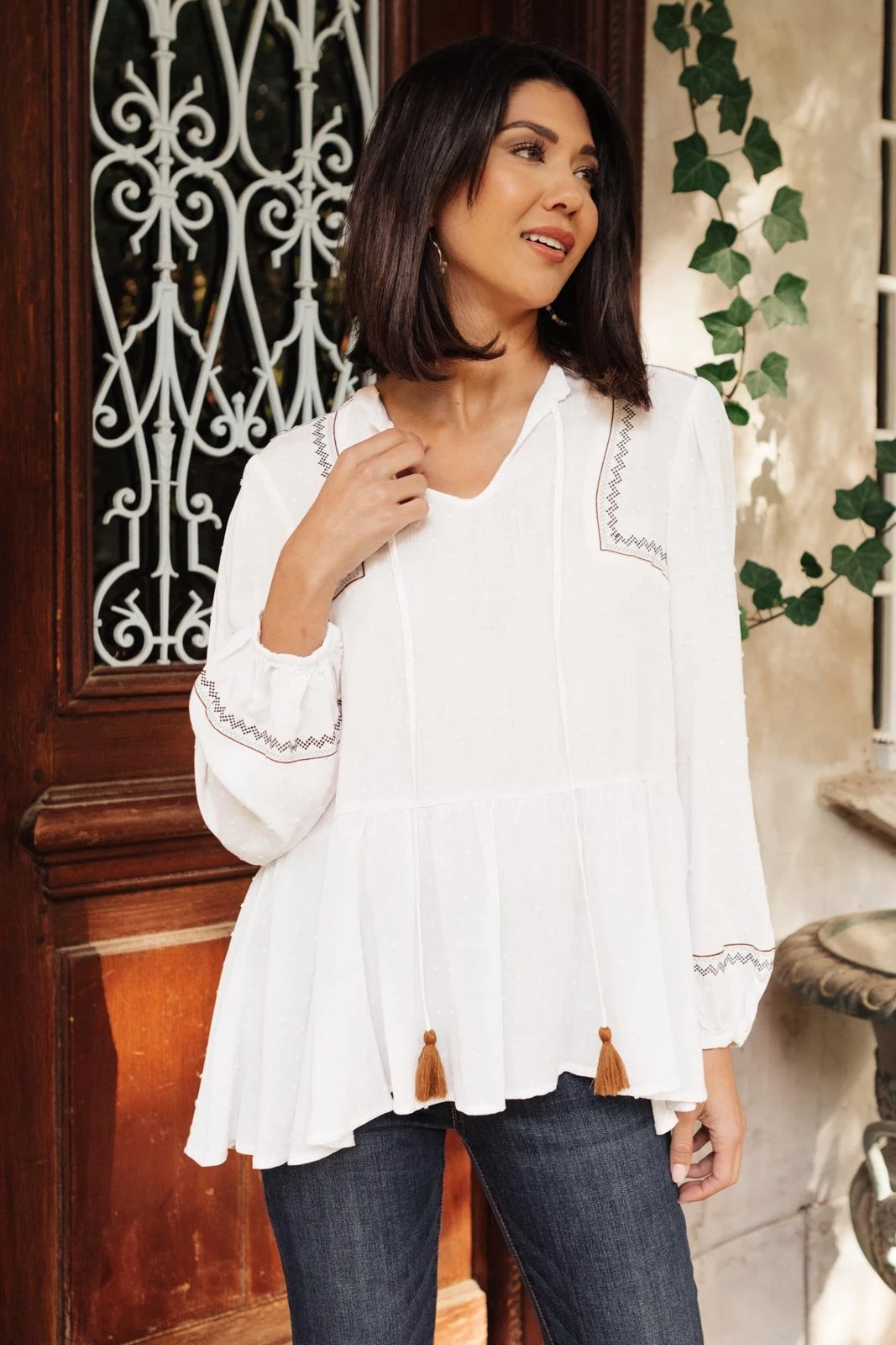 The Villager Dotted Top is a boho chic top that is effortlessly cool! The subtle texture of the Swiss dot fabric adds a special touch to this lightweight top. The necktie with tassels acts like a built in necklace and we are obsessed with the cross-stitch style details. Pair this darling top with wide leg pants and a felt hat.