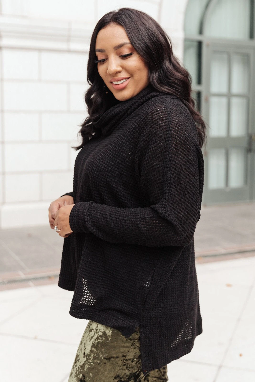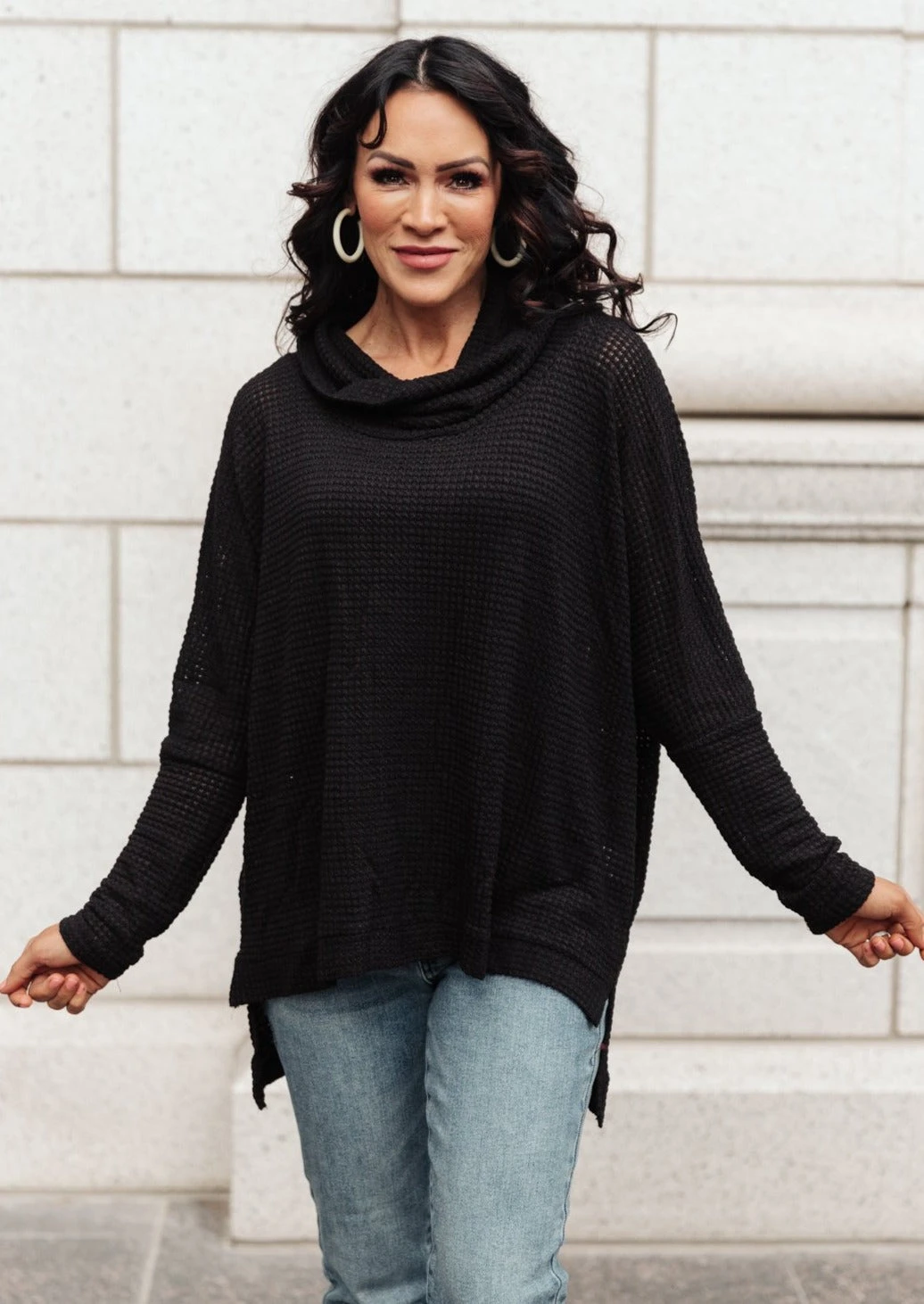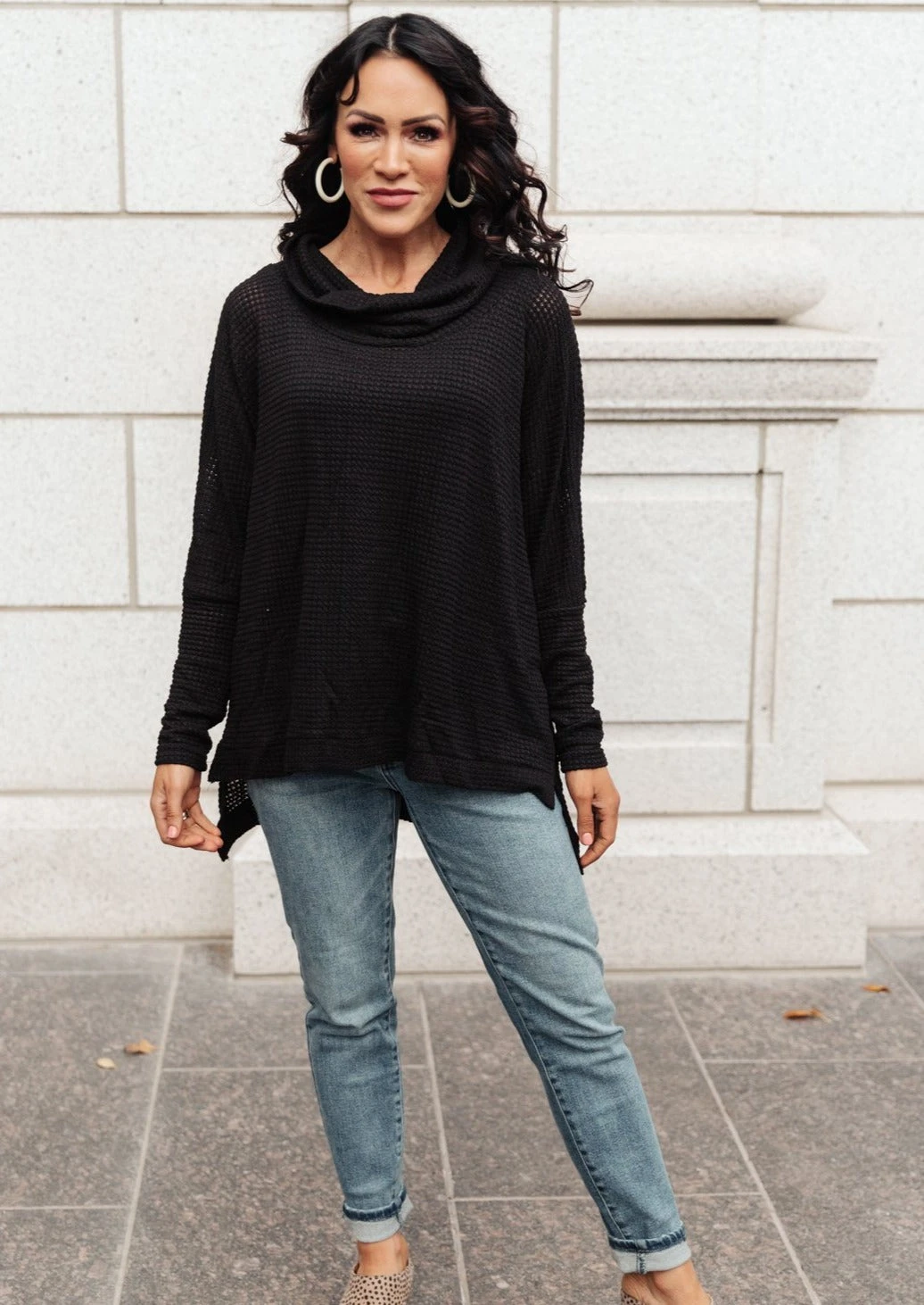 Keywords: Black Sweater, Warm, Cowl Neck , Waffle knit