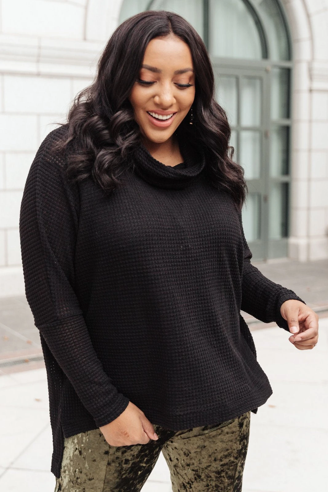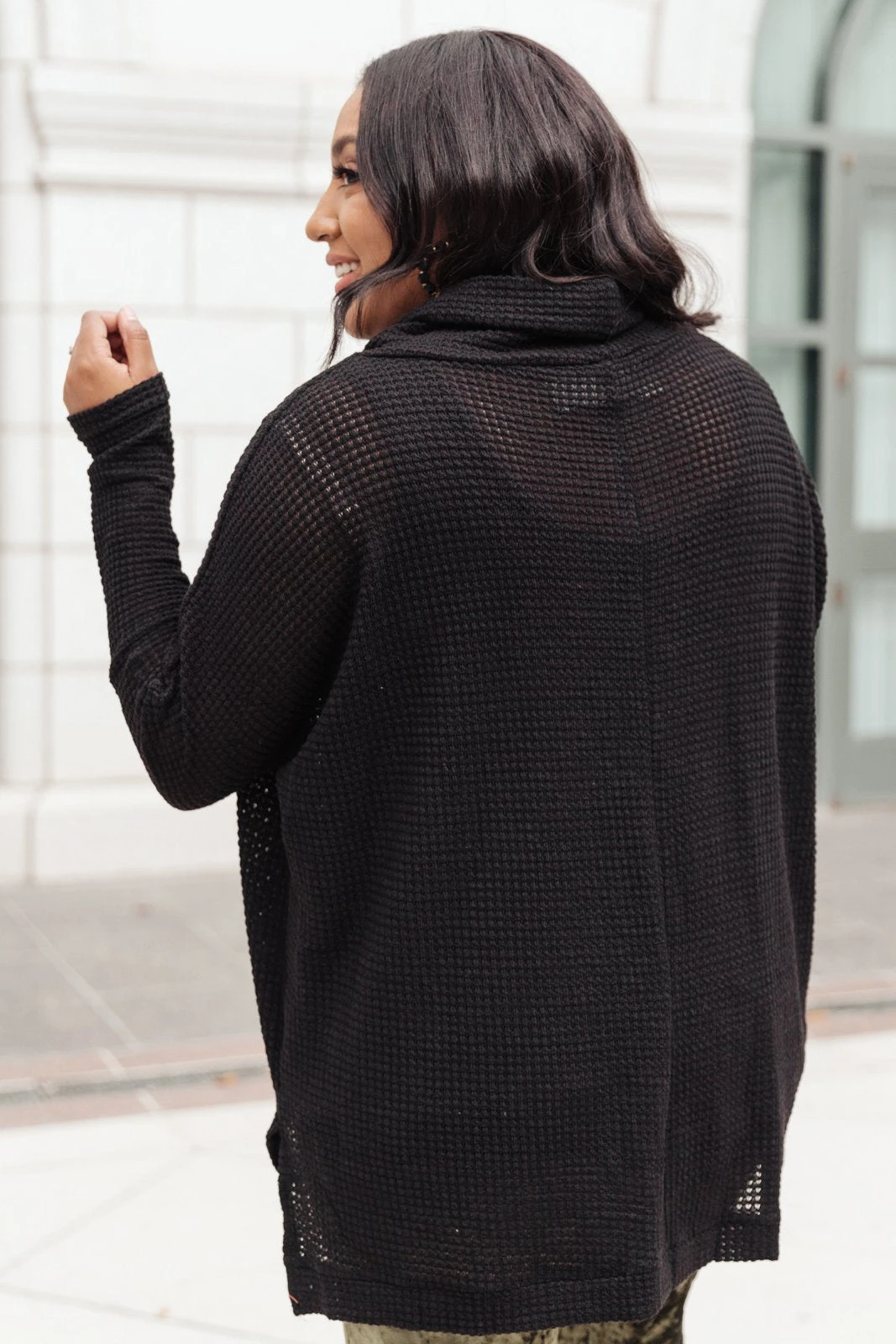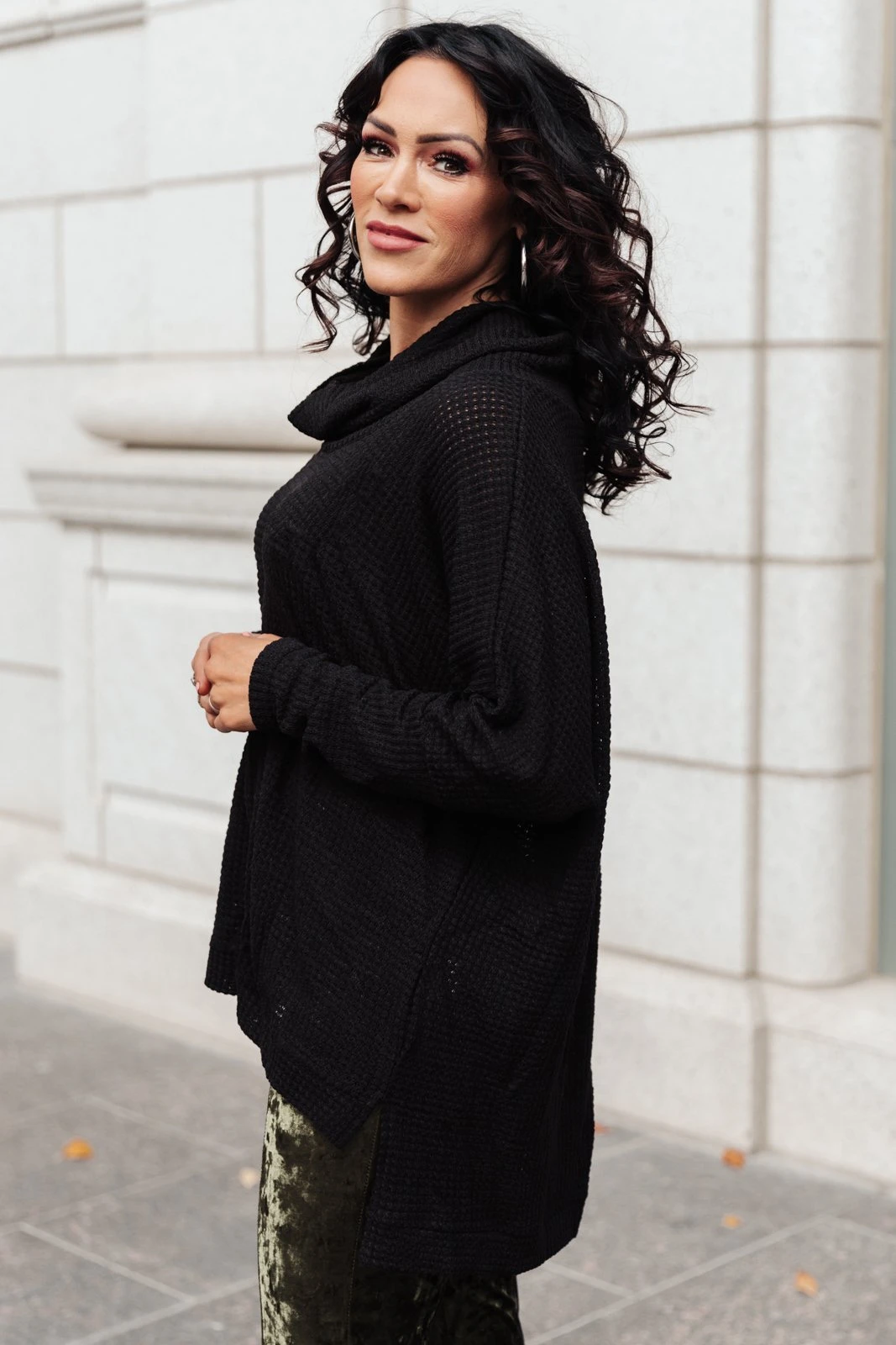 Keywords: Black Sweater, Warm, Cowl Neck , Waffle knit