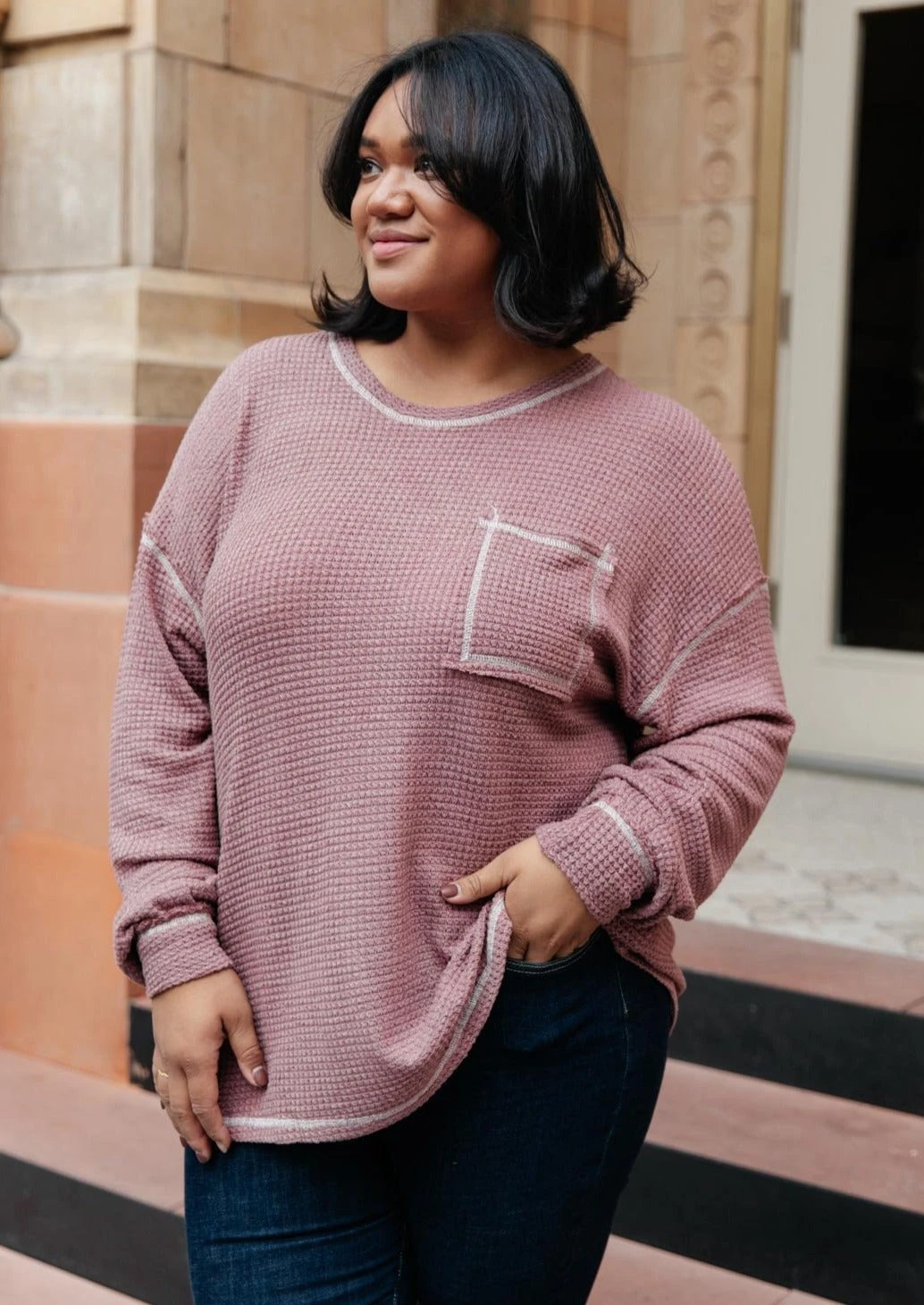 The In Stride Dropped Shoulder Tunic is a soft waffled top with contrasting white seams that make this top so interesting! The relaxed fit sleeves give us the warm fuzzies and we love the extra cute pocket detail. Pair this casual top with a cardigan, leggings and a beanie for the ultimate cozy look.