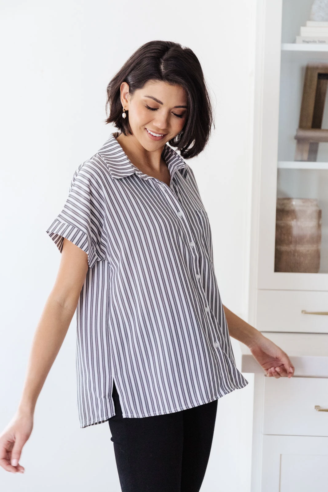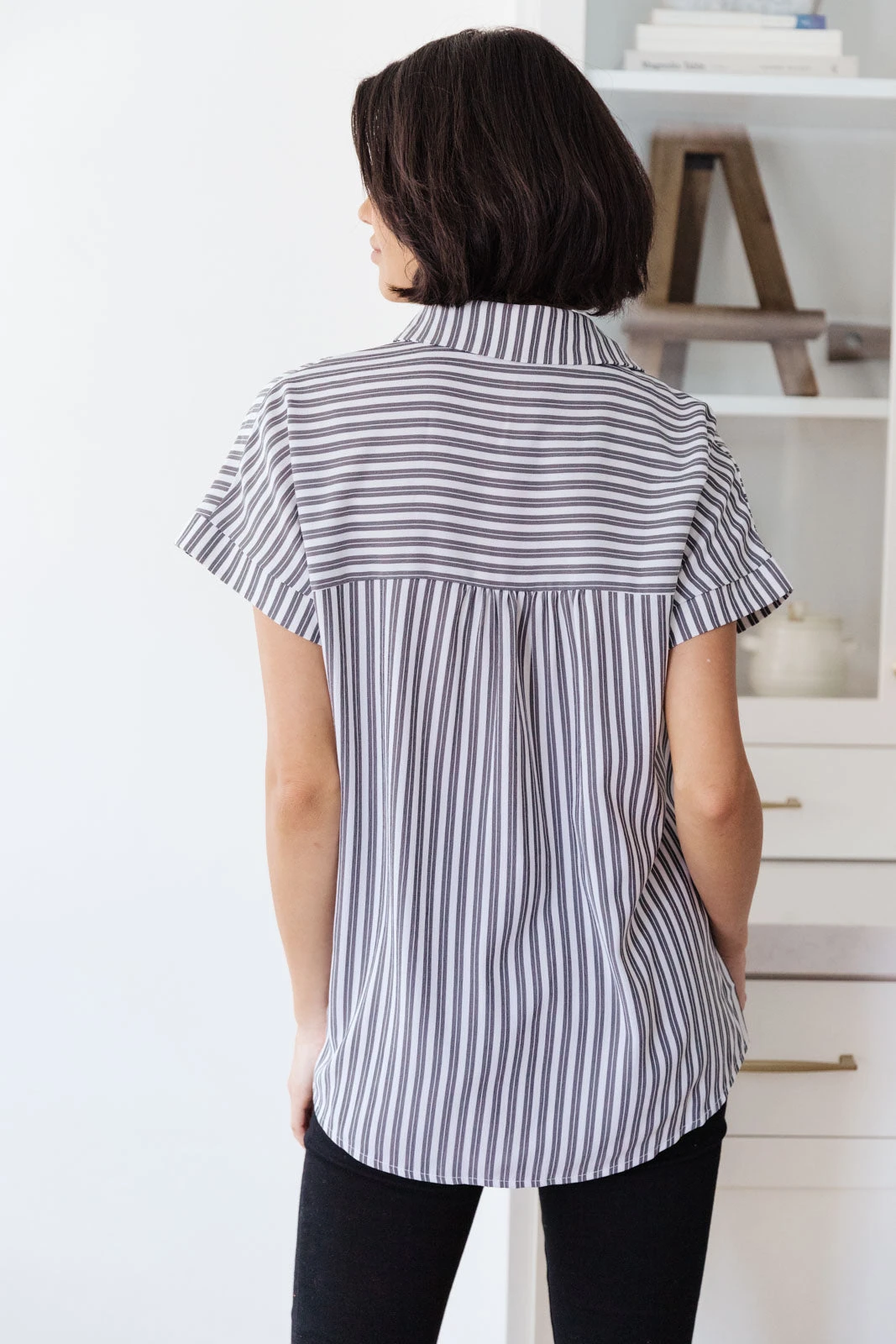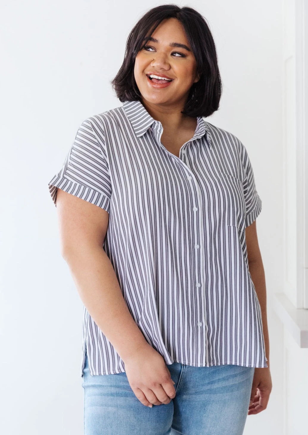 Keep it cute and classy in the Marina Striped Top! A lightweight woven fabric creates a collared neckline, and cuffed, dolman short sleeves. A relaxed bodice features a front patch pocket, and full button placket. Pair with jeans and a blazer for a casual-chic workday look.