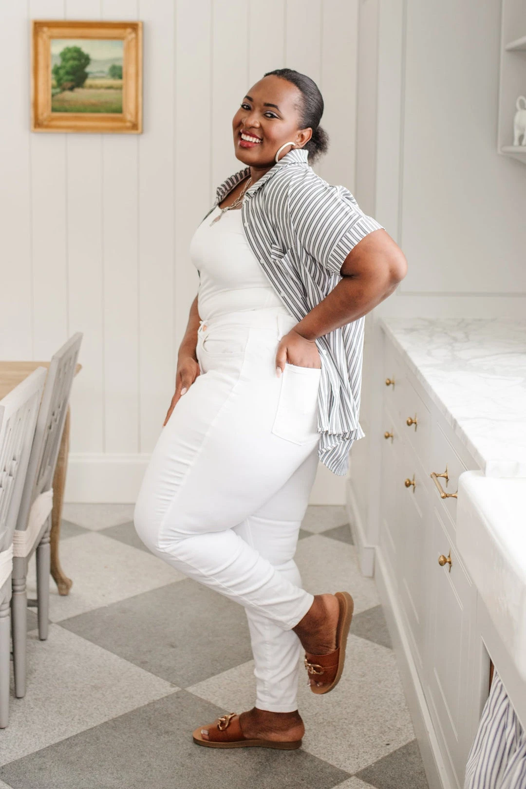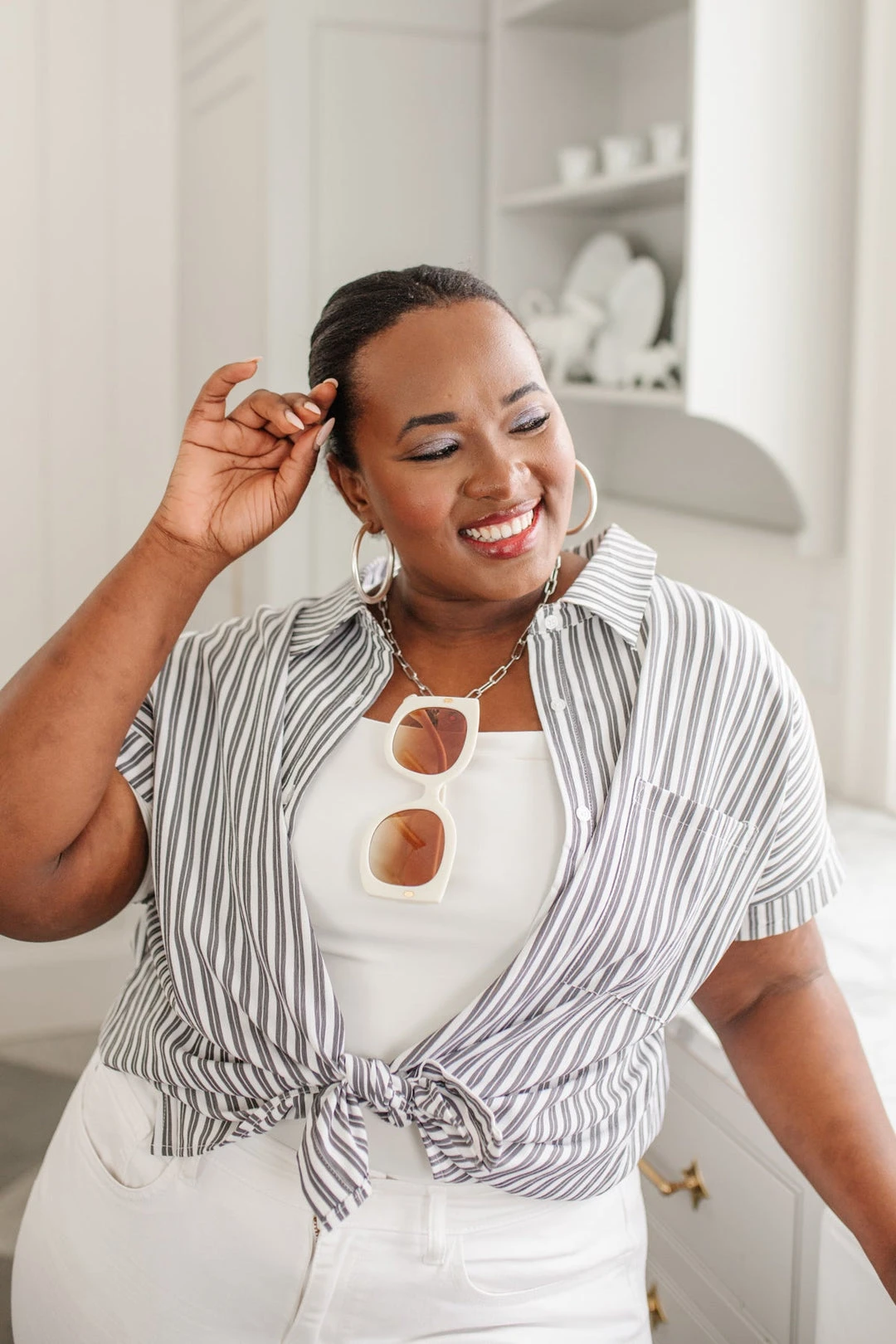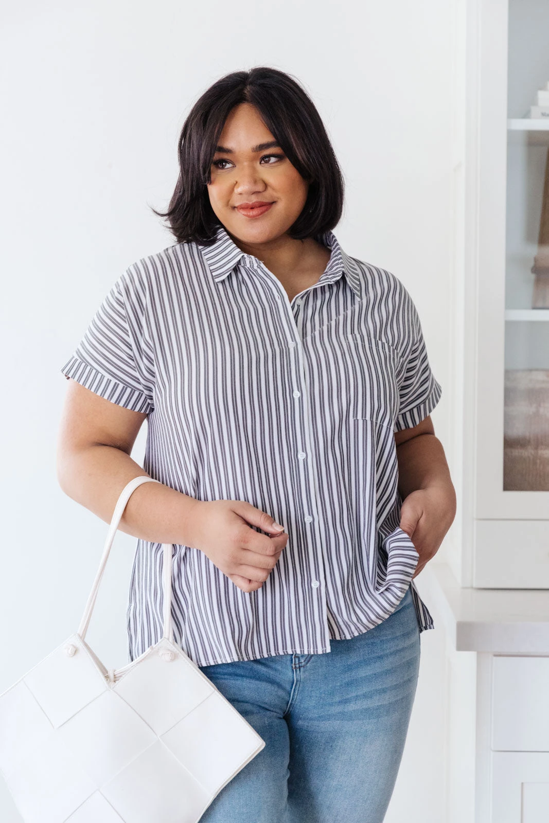 Keep it cute and classy in the Marina Striped Top! A lightweight woven fabric creates a collared neckline, and cuffed, dolman short sleeves. A relaxed bodice features a front patch pocket, and full button placket. Pair with jeans and a blazer for a casual-chic workday look.