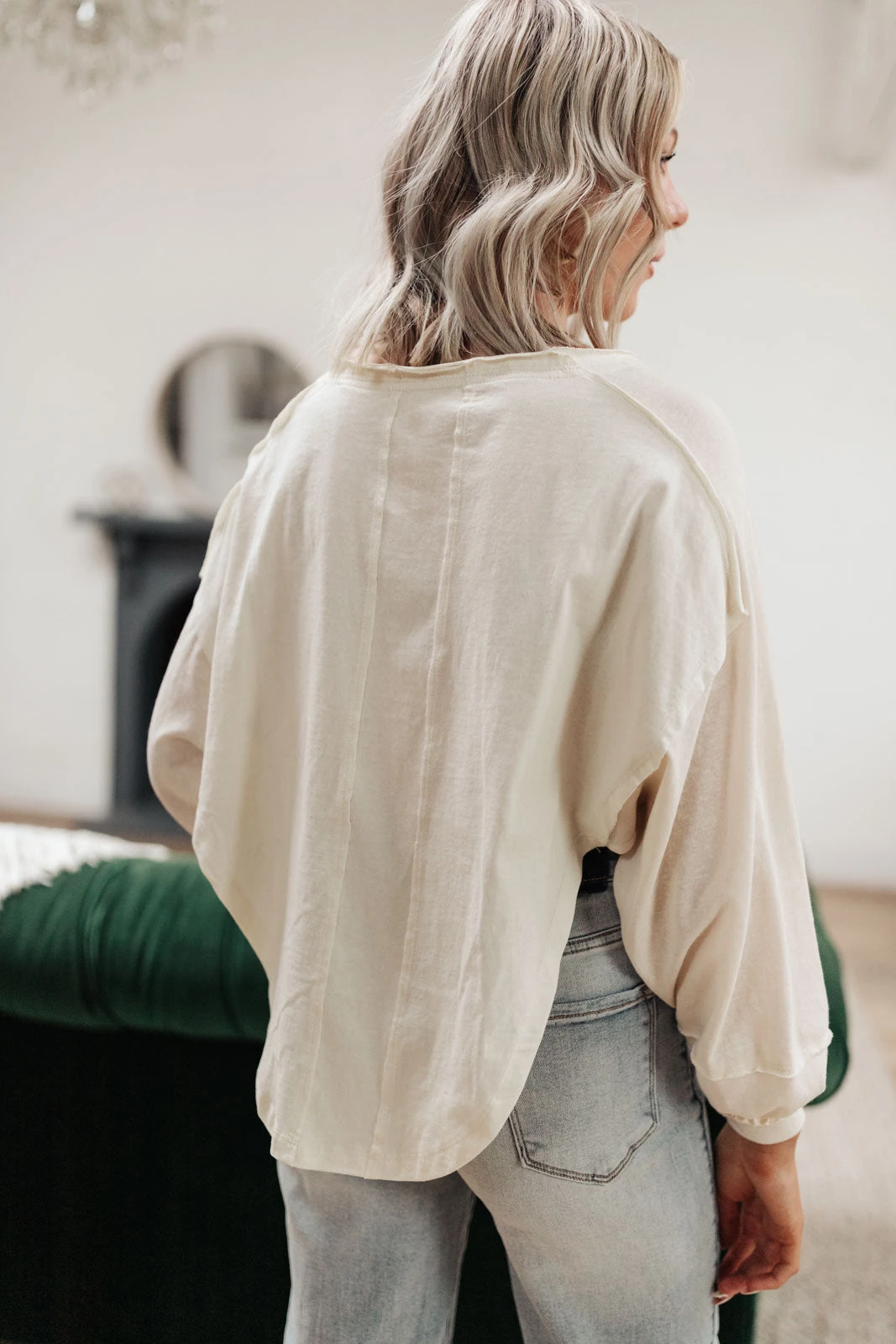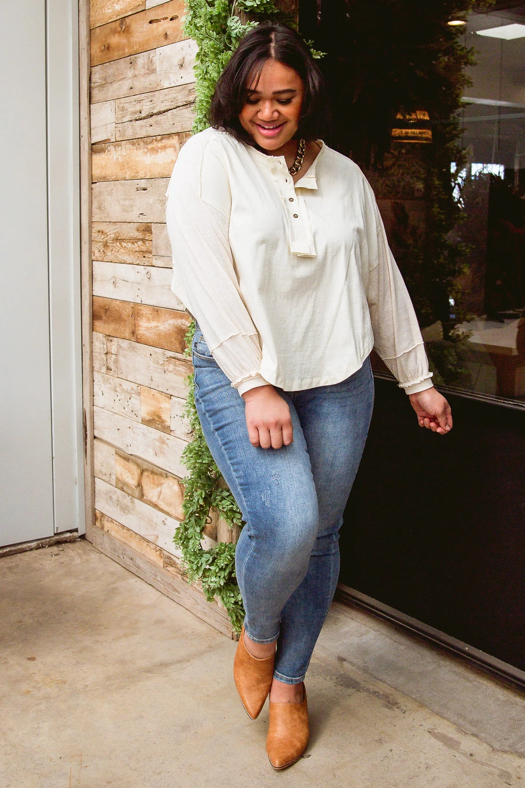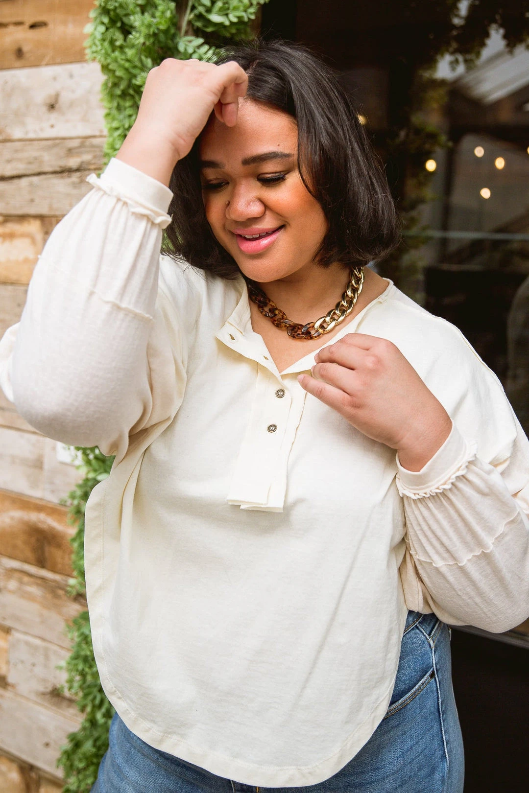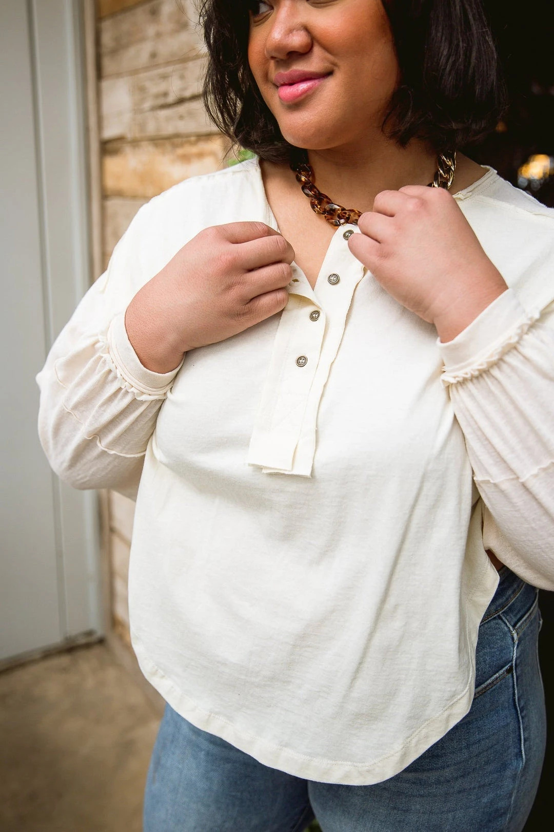 Stand out in this essential tee. The Osaka Top is a fun and unique take on your classic henley long sleeve. We love the look it lends, with a high side shark bite cut, raw hem detail, balloon sleeves, and rustic four button henley.