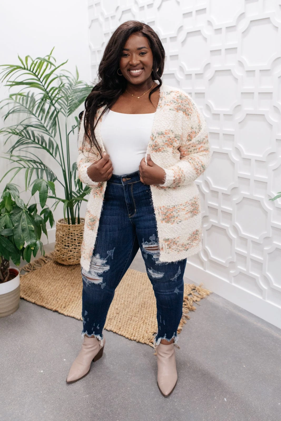 The Warm Comfort Cardigan is exactly that – warm and comfortable! Did we mention it’s super soft too!? This cardigan is beautifully threaded with orange, green and yellow detail that creates a striped pattern throughout the piece. We absolutely love the statement it makes paired with a simple outfit.