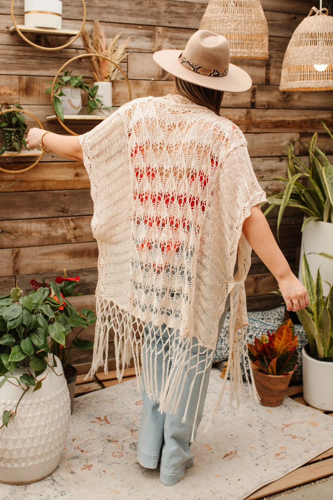 The World Traveler Cardigan is a beautiful year-round layering piece! This open knit cardigan has a beautiful fringe hem and wide, comfy sleeves. Add interest to any outfit with this gorgeous design. Pair this statement cardigan with a lace bralette, dress or tunic for a perfectly layered look.