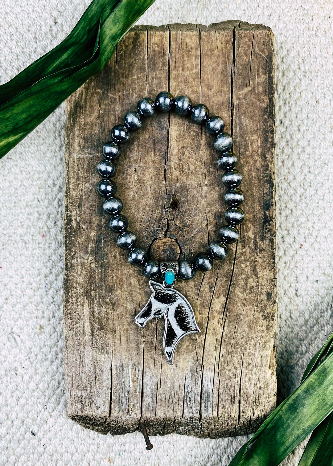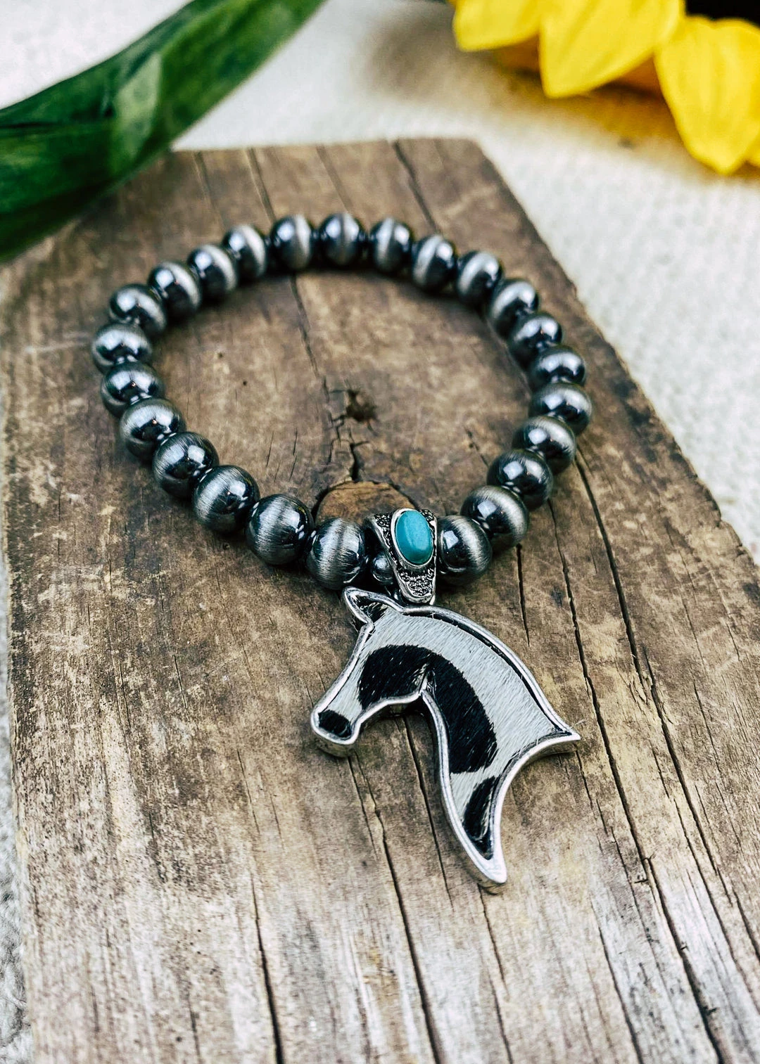 This bracelet is perfect for any horse lover! Cowhide pattern will vary.Â