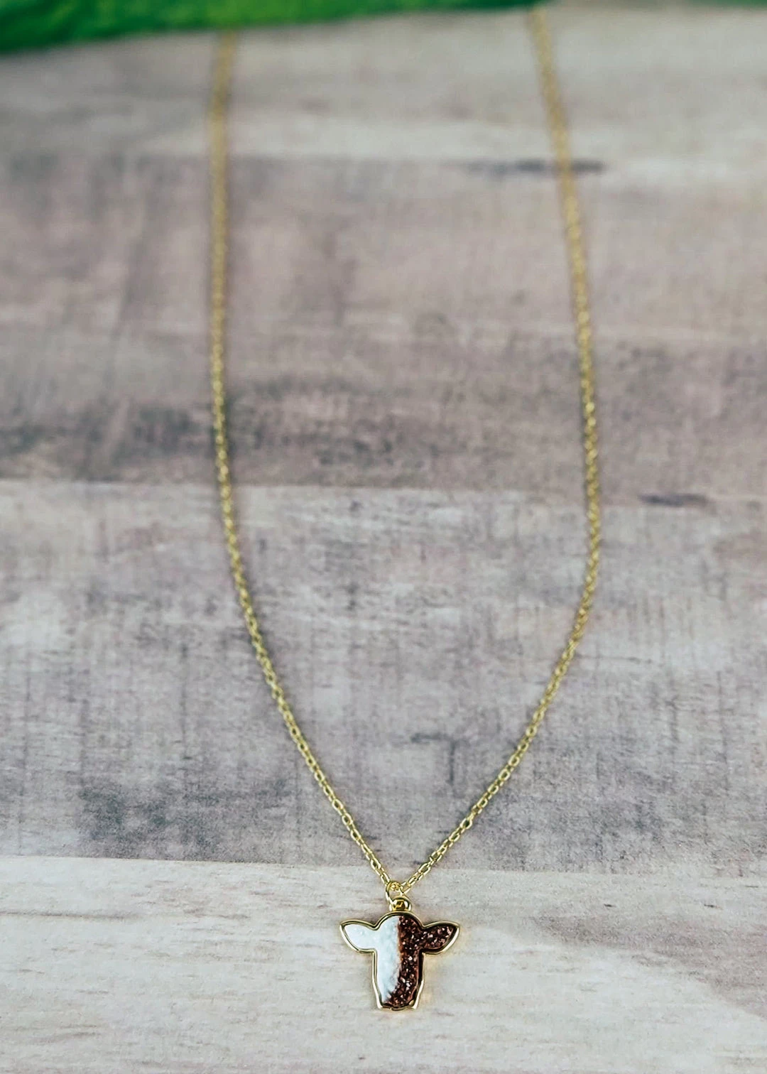 - Crafted with exquisite attention to detail, this necklace features a beautiful druzy cow pendant adorned with blue tortoise and white accents.