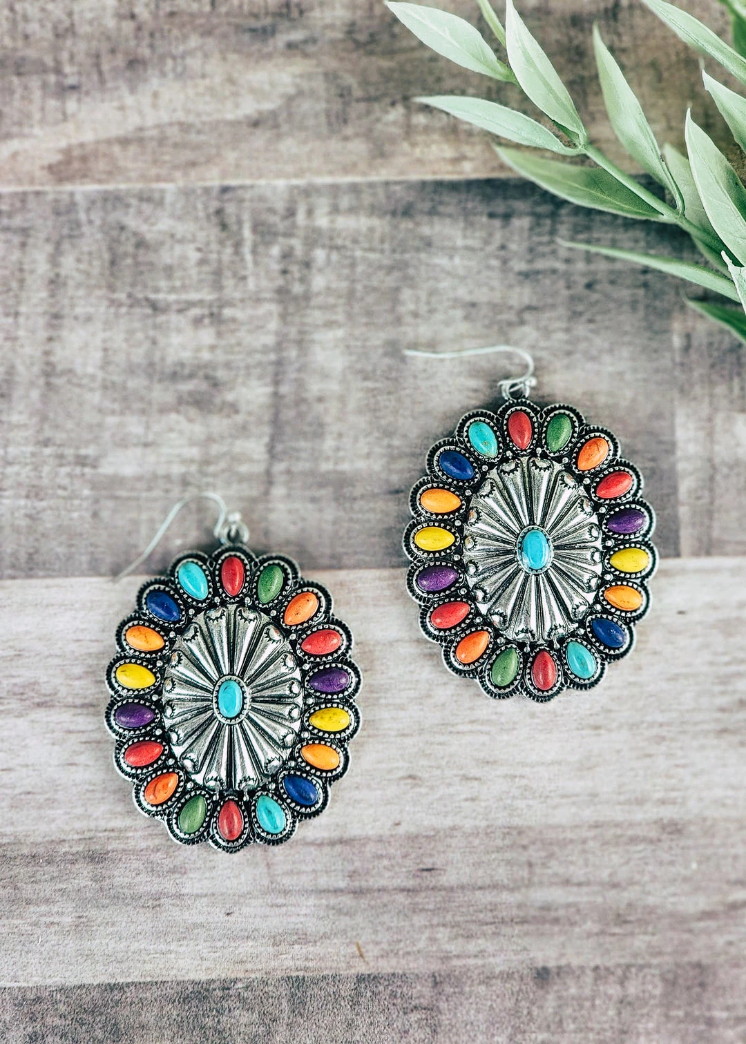 - The unique tortoise shell design combined with colorful conchos makes these earrings a standout piece in any jewelry collection.