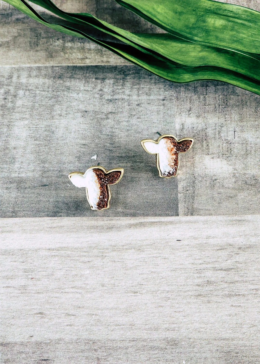 - Elevate your style with our Blue Tortoise Jewelry Brown & White Druzy Cow Head Earrings. These unique statement earrings feature a stunning druzy stone design in brown and white hues, making them a perfect accessory for any outfit.