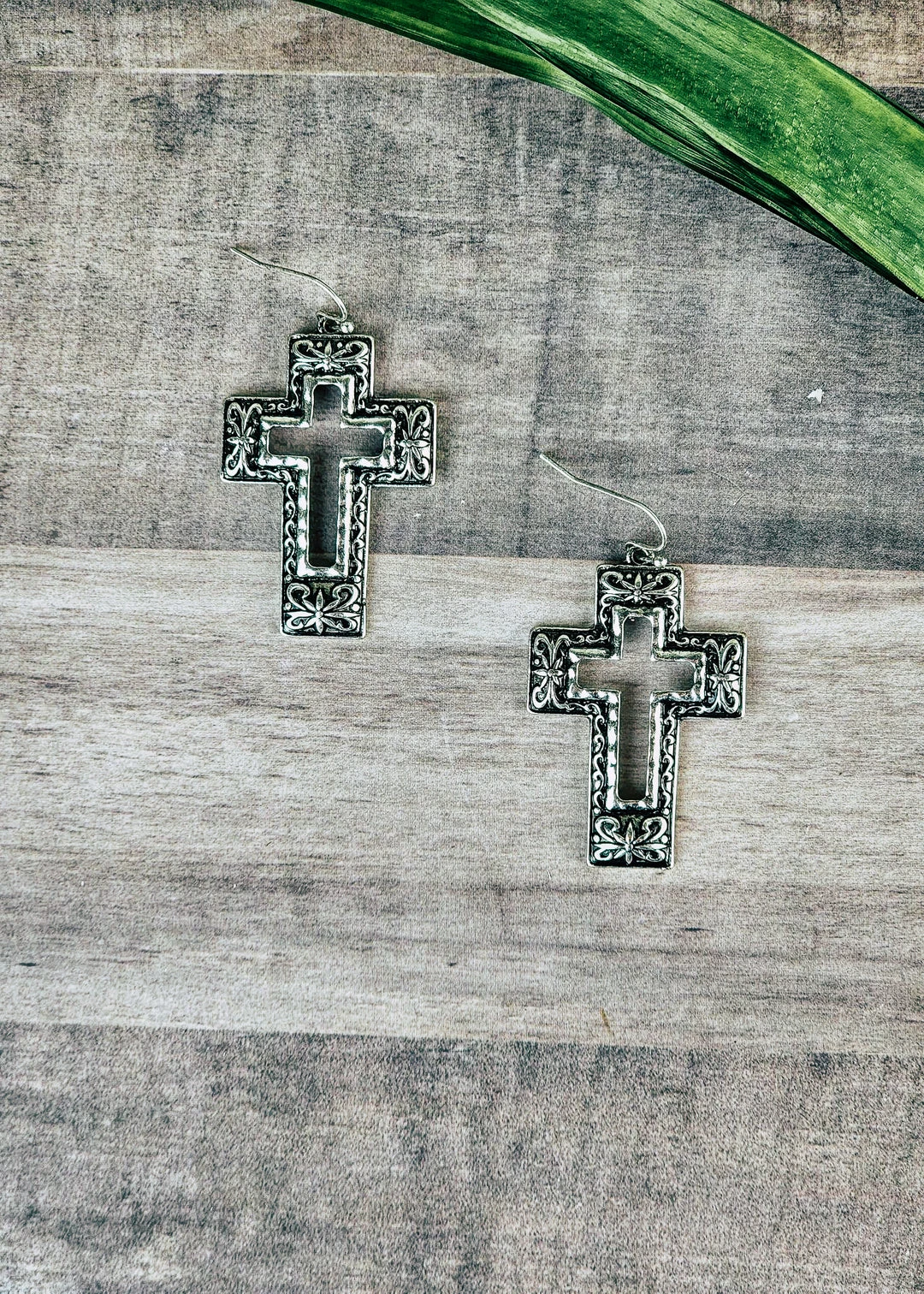 - Elevate your style with our Blue Tortoise Jewelry Western Cutout Cross Earrings. These earrings feature a unique cutout cross design inspired by Western aesthetics, making them a standout addition to your jewelry collection.