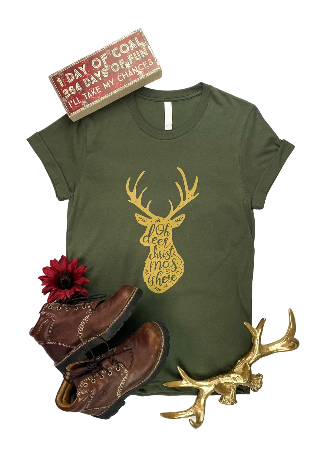 - Celebrate the holiday season with the Cinchy Cowgirl Army Green Oh Deer Christmas Short Sleeve Tee, a perfect blend of festive charm and casual comfort.