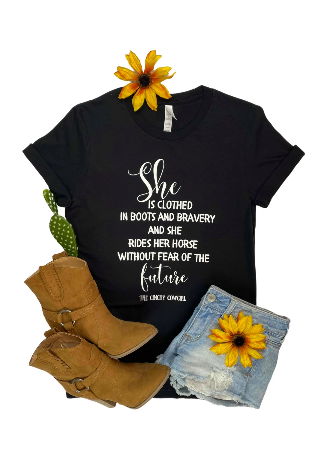 - The Cinchy Cowgirl Black Graphic Tee is a trendy and comfortable short sleeve t-shirt designed for women who love a casual yet stylish look.