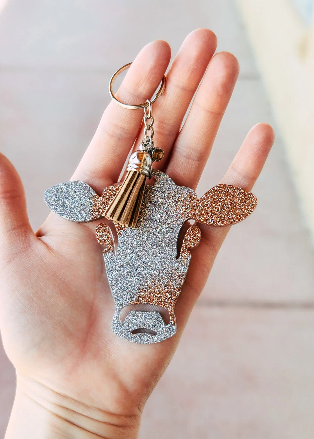 - Unique Cowgirl Design: Featuring a chic champagne and holographic silver cow head design, this keychain is perfect for cowgirl enthusiasts and fashion lovers.