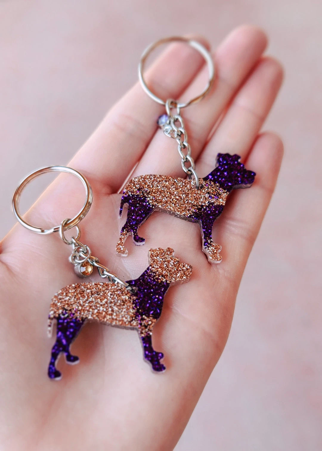 - This set includes two beautifully crafted resin keychains: a Cinchy Cowgirl in champagne tones and a Purple Pitbull in vibrant purple. Each keychain is designed with intricate details and a glossy finish, making them both stylish and durable.