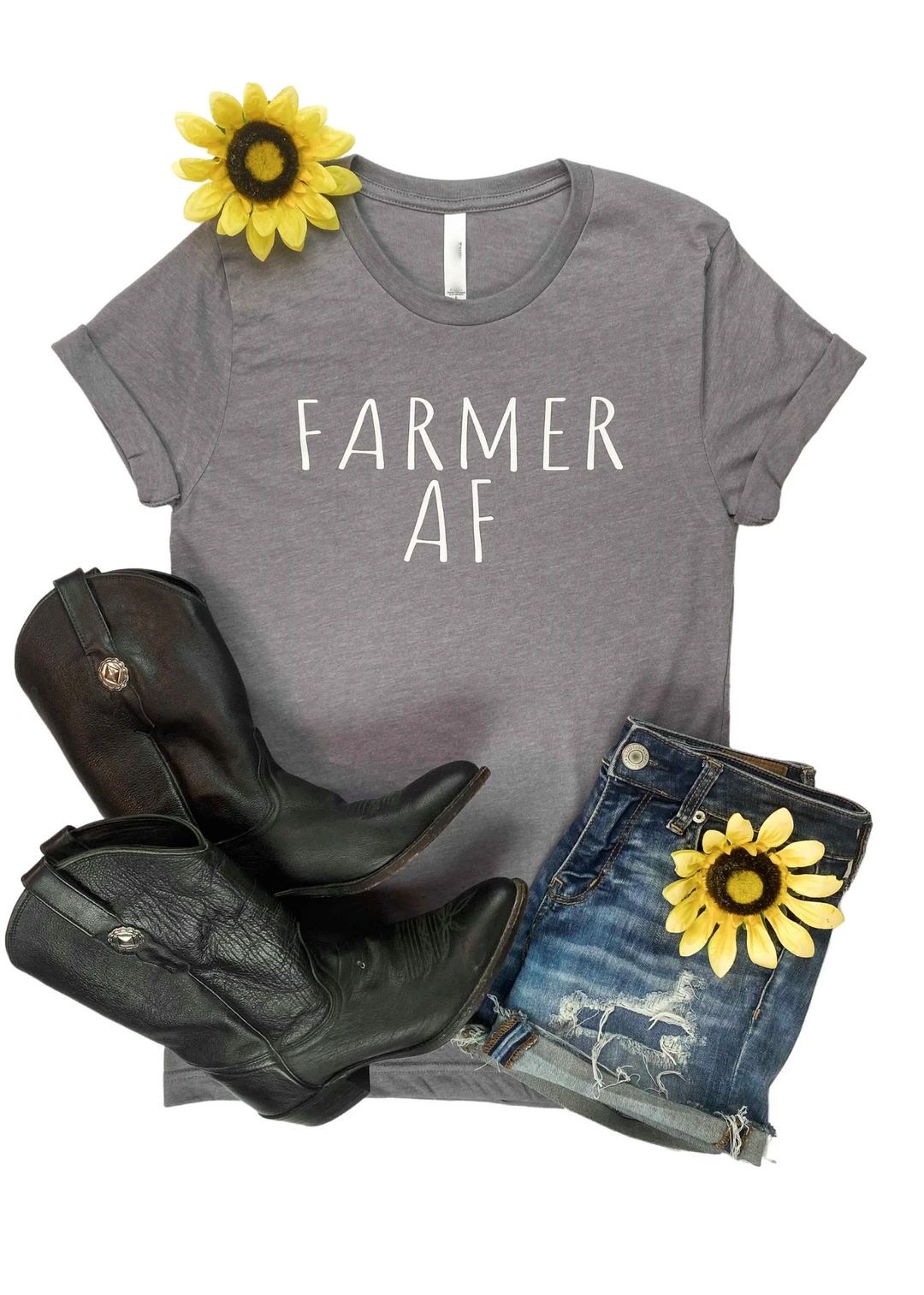 A must have for all Farmers! Printed on a super soft Heather Grey tee with white lettering.