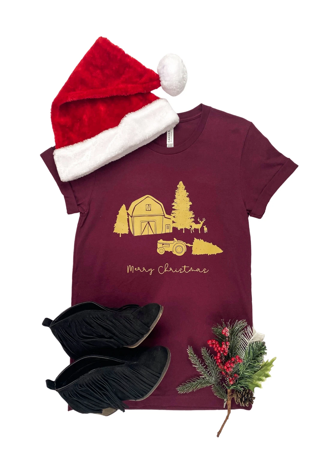 - Celebrate the holiday season with our Cinchy Cowgirl Christmas Farm Tee featuring a playful maroon Merry Christmas graphic, ideal for farm and ranch enthusiasts.