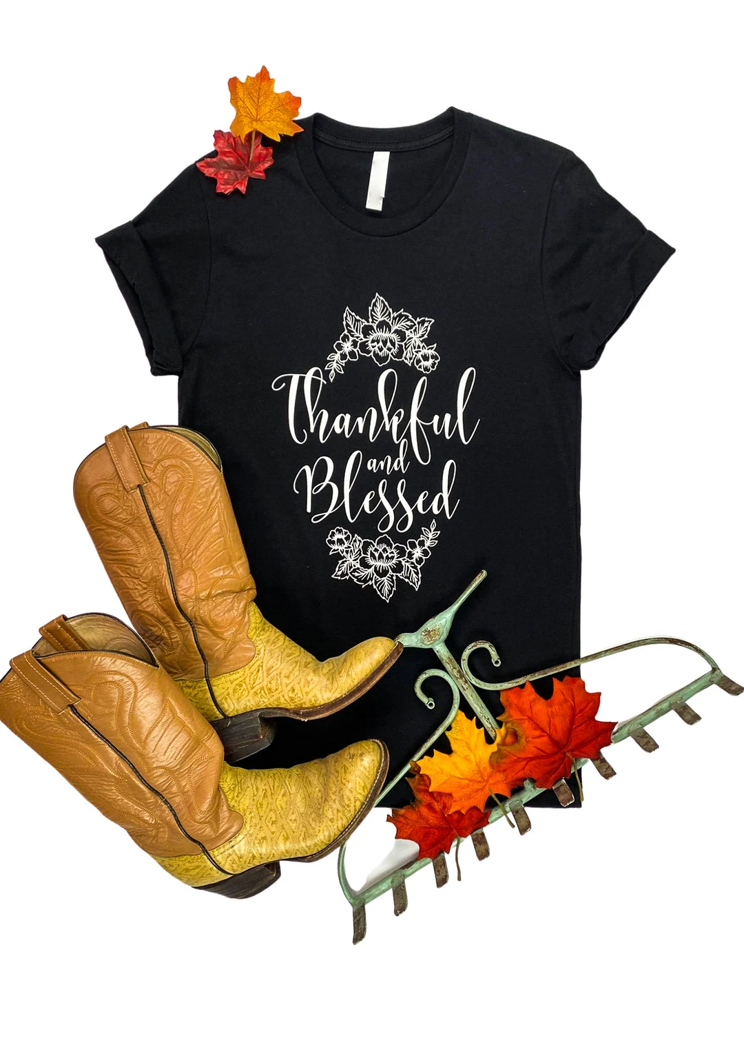 - Elevate your casual wardrobe with the Cinchy Cowgirl CLOSEOUT – Black Thankful & Blessed Short Sleeve Tee. This stylish tee features a bold ‘Thankful & Blessed’ graphic design, perfect for everyday wear.