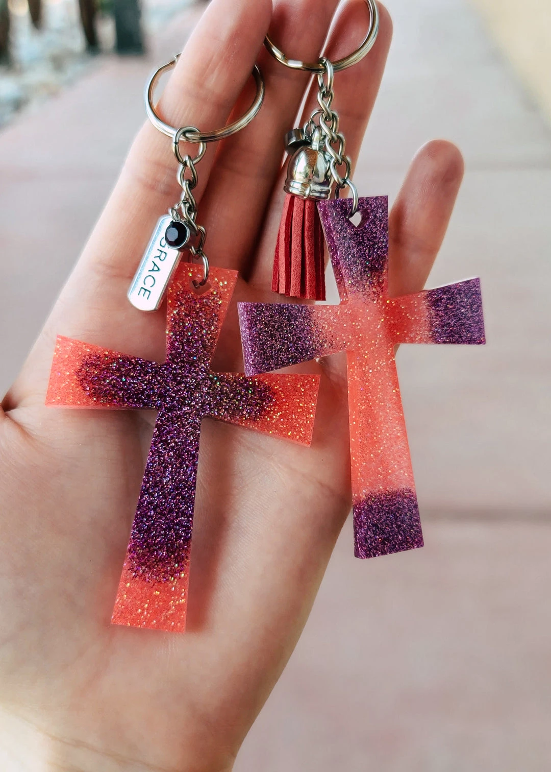 - Introducing the Cinchy Cowgirl Coral & Purple Resin Keychain Set Of 2 – a perfect blend of style and functionality.