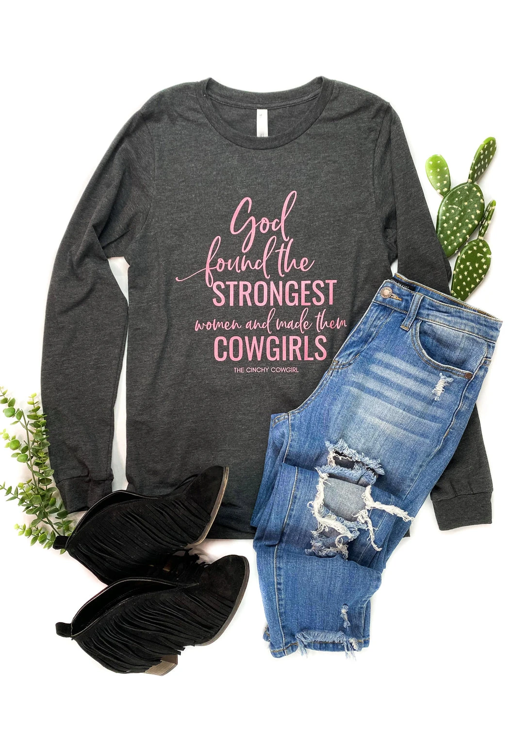 - Elevate your casual wardrobe with the Cinchy Cowgirl Dark Heather Grey Women’s Long Sleeve Graphic Tee. Featuring a bold design, this tee is perfect for everyday wear.
