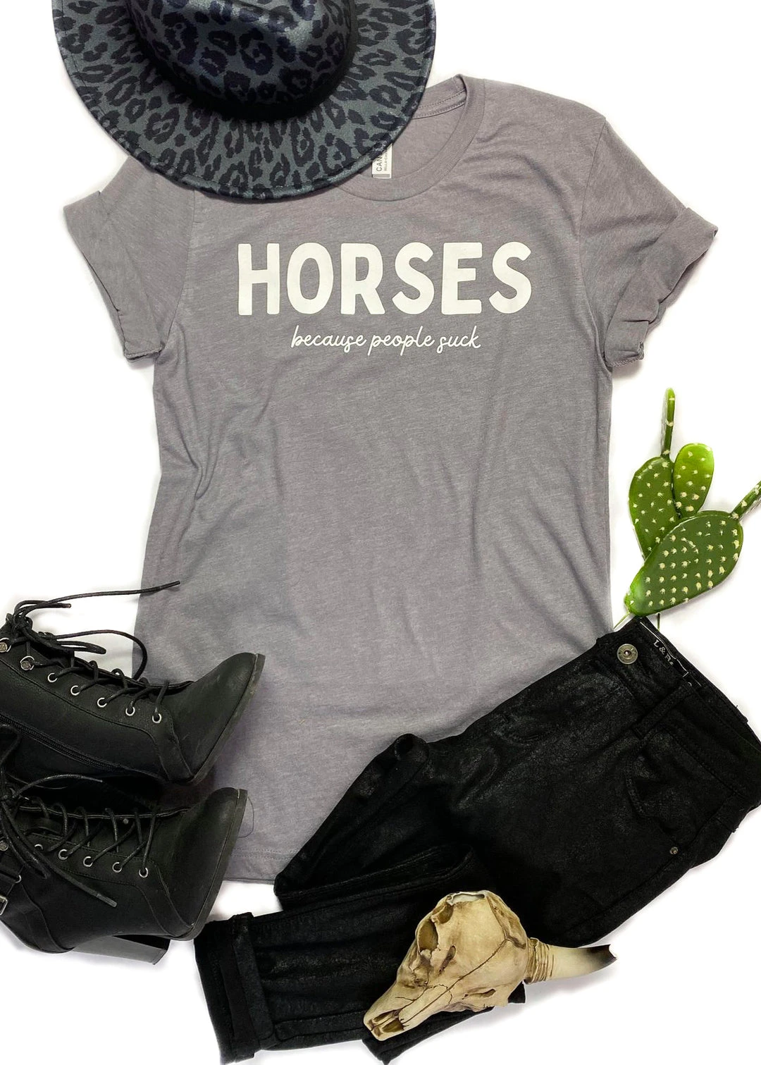 - Express your love for horses with the Cinchy Cowgirl Heather Grey ‘Horses Because People Suck’ Graphic Tee. This short sleeve shirt is perfect for casual outings, offering both comfort and a bold statement.