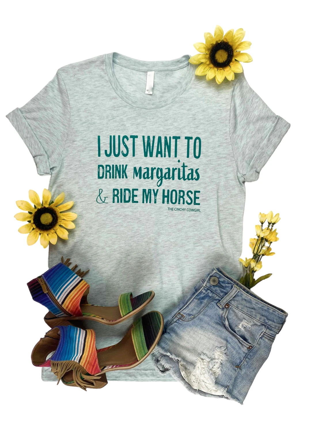 - The eye-catching ‘Drink Margaritas & Ride My Horse’ graphic adds a playful touch, making it a standout piece in your wardrobe. Available in a refreshing ice blue color.