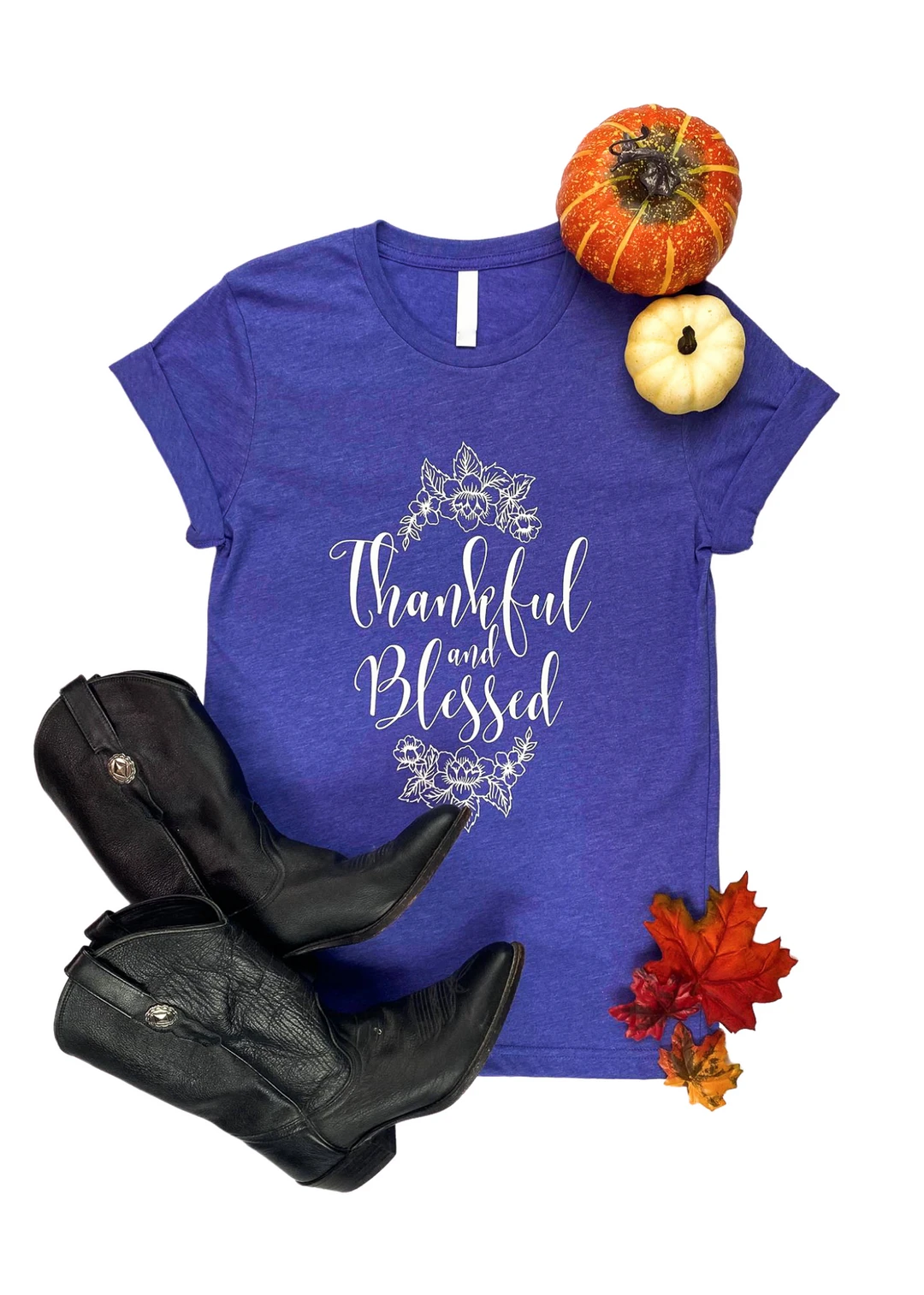 - Showcase your unique style with the eye-catching lapis color and the ‘Thankful & Blessed’ graphic design. Stand out in this trendy piece.
